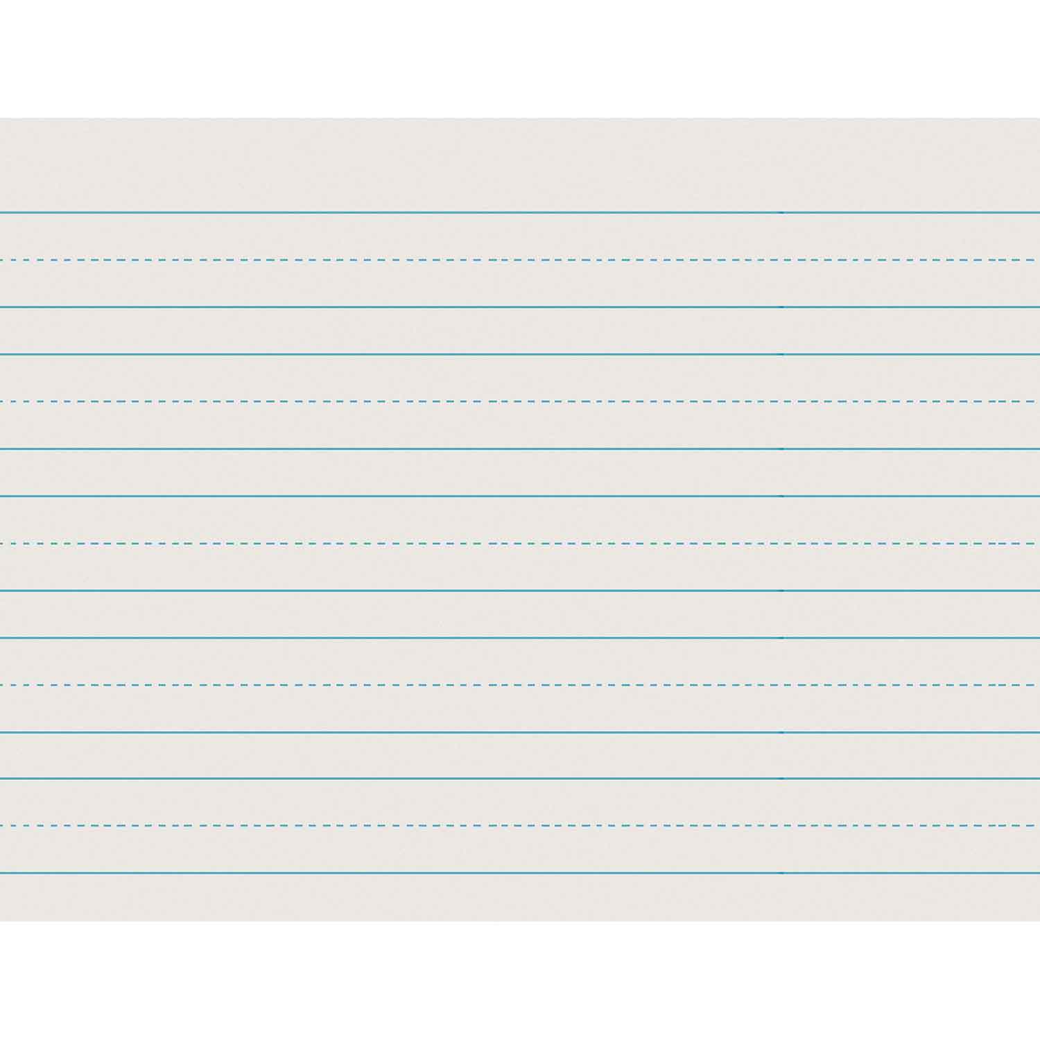 Clean white newsprint has light blue ruling on both sides. Sheets are ruled 1" the long way and a ½" dotted center line serves as a guide for controlled writing. Also includes ½" skip space allows room for letter descenders. Ruled long way (landscape) with no margin.