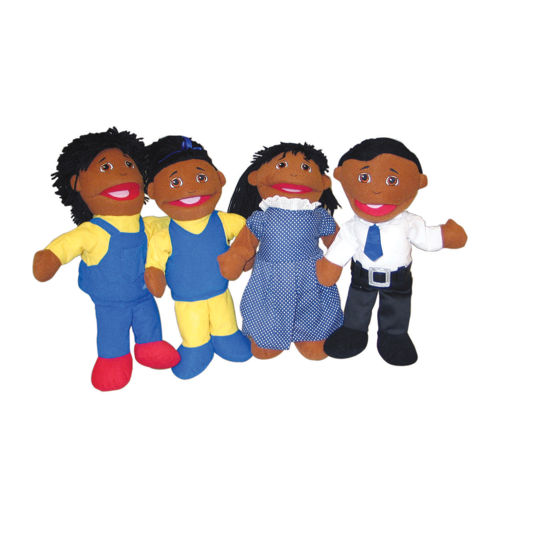 With embroidered faces, yarn hair and movable mouths, these African-American family puppets are dressed for school and work.