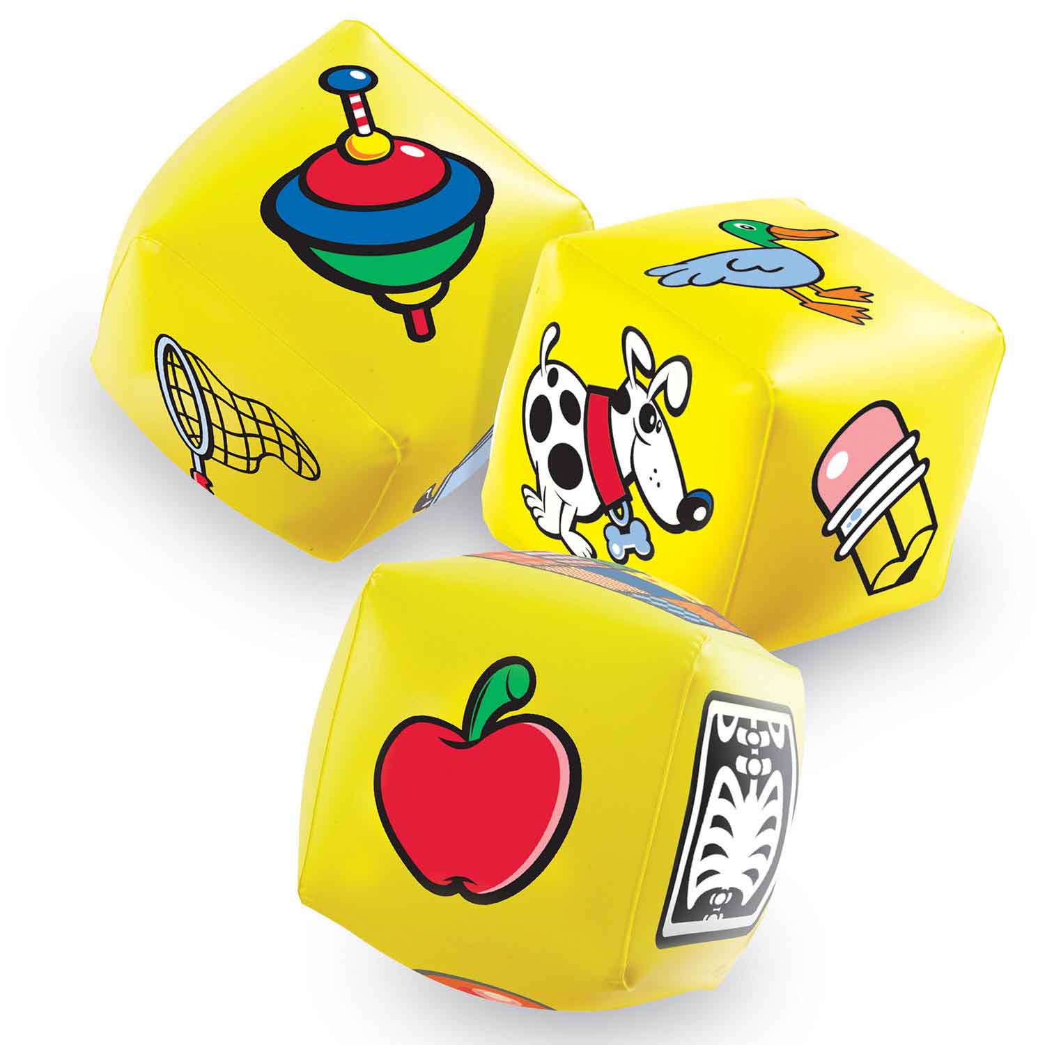 - Includes vinyl mat, 5 inflatable cubes illustrated with familiar objects, game markers and activity guide