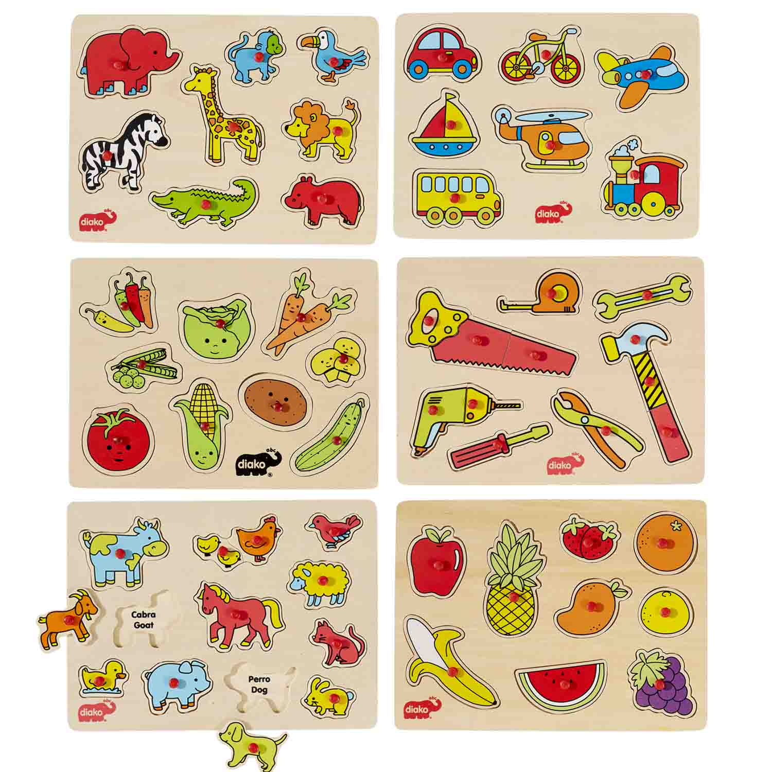 - Set of 6 bilingual peg puzzles