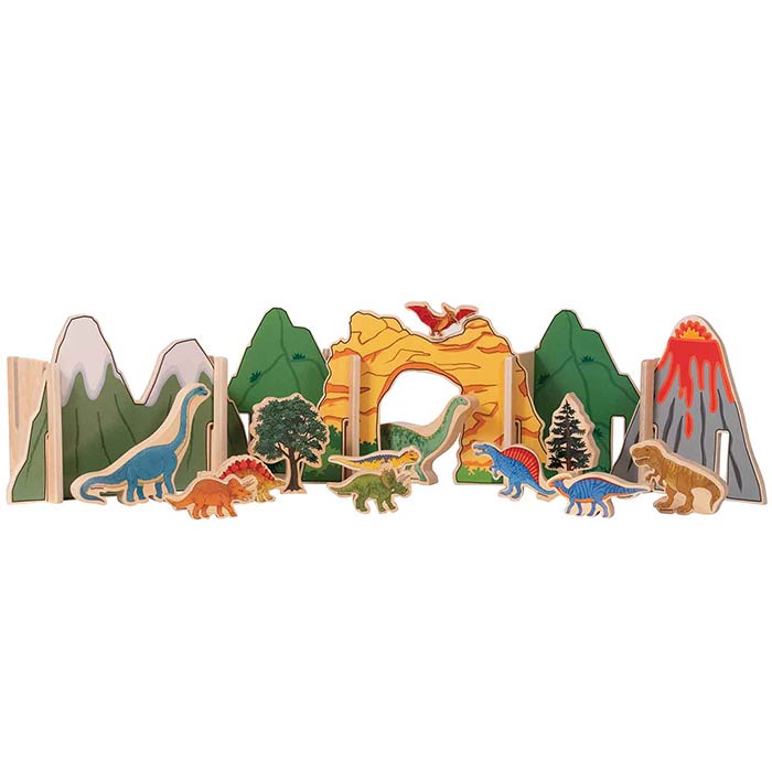 This colorful wooden play set shows dinosaurs in their environments. Birch plywood pieces easily slot together with pre-cut grooves that connect in a variety of ways.