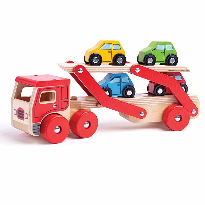 This wooden car carrier helps to develop dexterity and coordination as children play. It carries four colorful wooden cars, and the upper deck can be easily lowered to allow each vehicle to drive on and off. Grooves in the surface help to keep each car in place as they're transported to their destination.