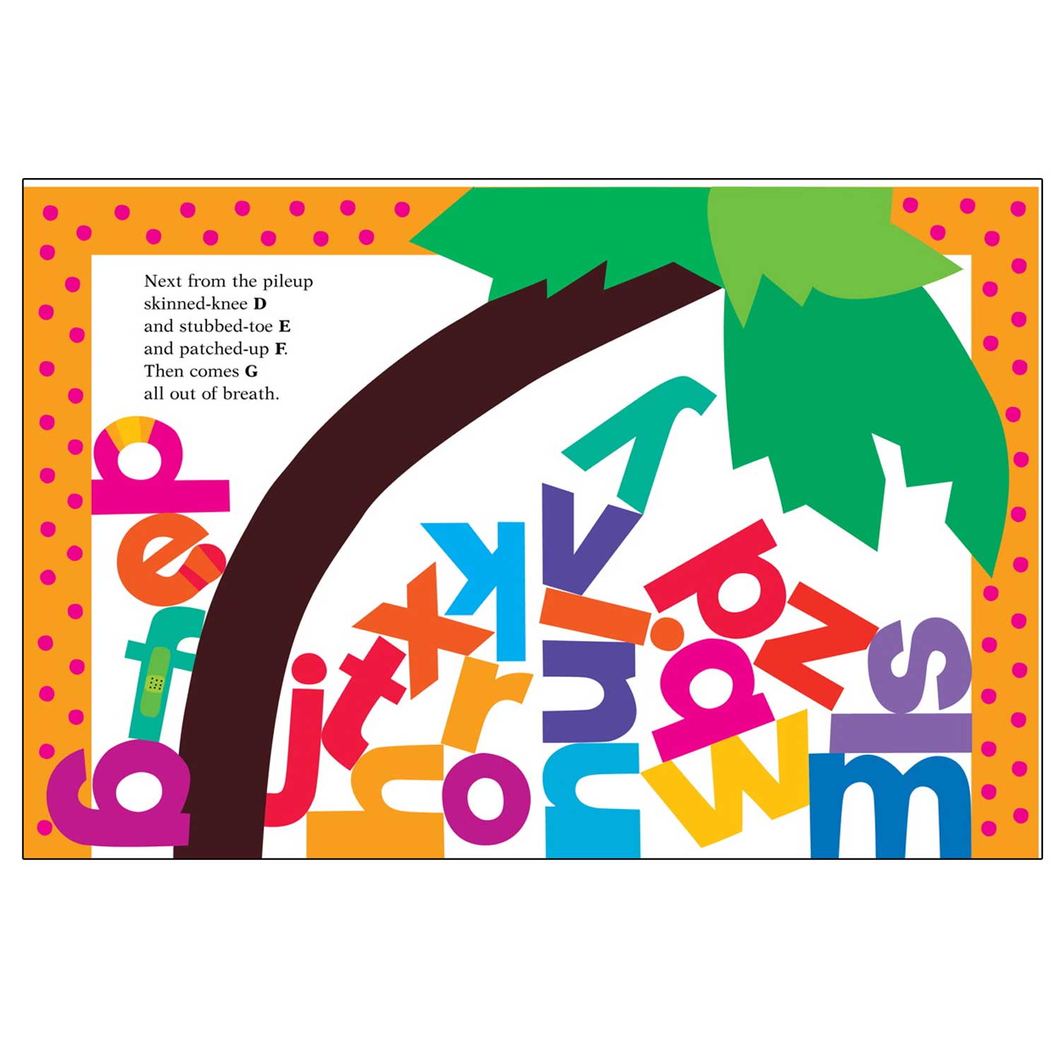 A told B, and B told C, I'll meet you at the top of the coconut tree. In this lively alphabet rhyme, all the letters of the alphabet race each other up the coconut tree. Will there be enough room? Oh, no - Chicka Chicka Boom! Boom! A rhythmic alphabet chant that rolls along on waves of fun. A rainbow of bright, bold, cheerful colors makes the merry parade of letters unforgettable.