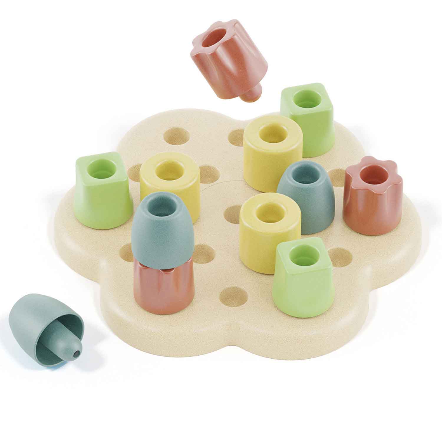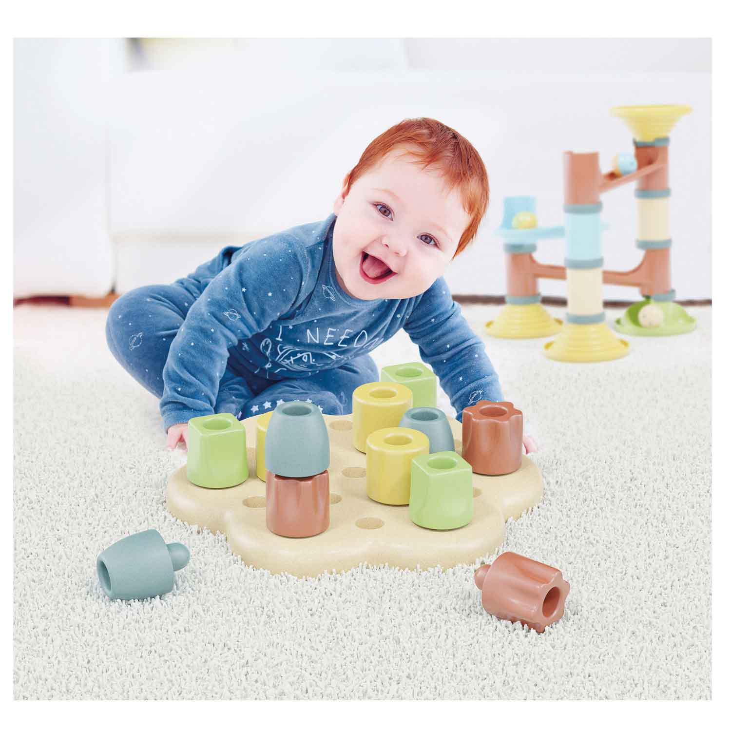 Large pegs are easy to hold and fit together or into the board—great for hand-eye coordination! Includes board with 12 peg pieces.