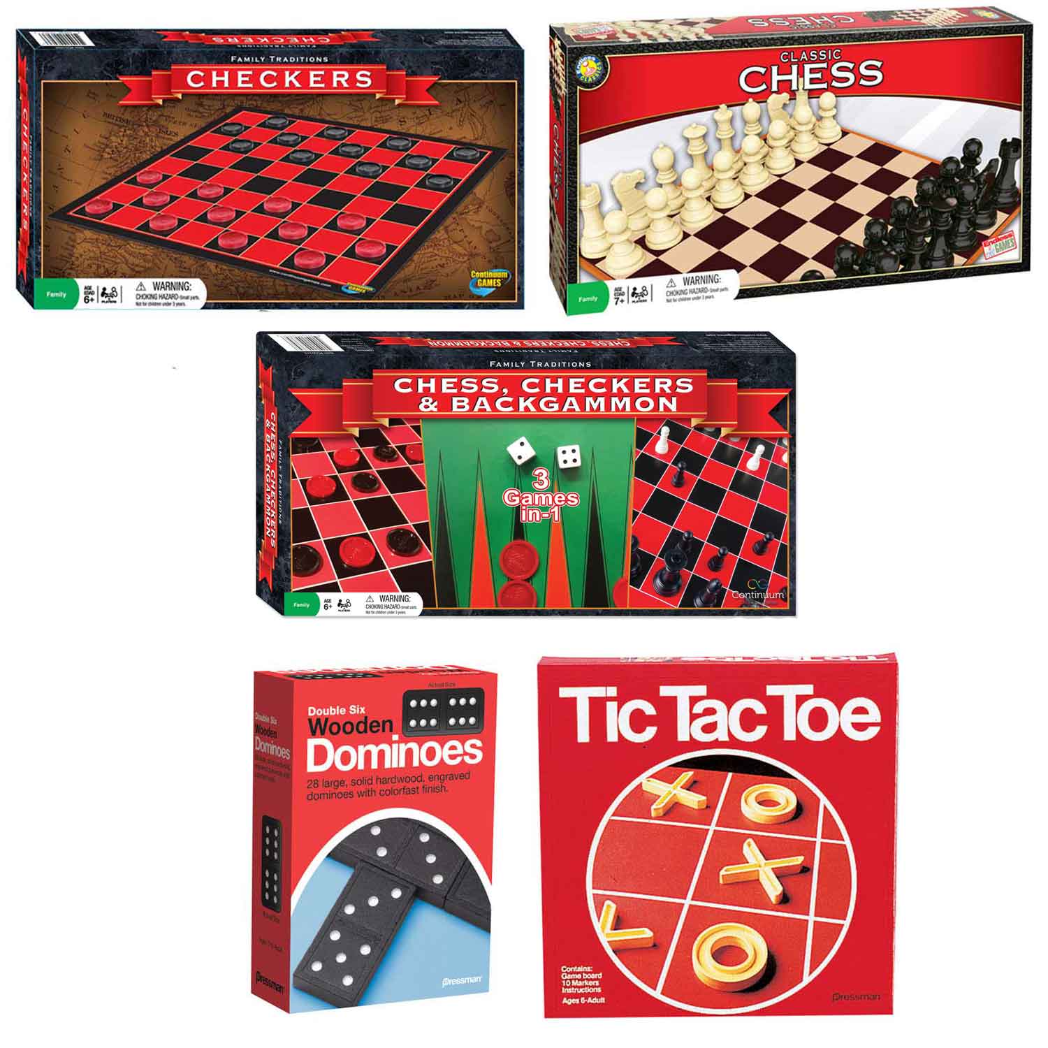 All the classic games in one convenient set. Includes chess, checkers, backgammon, tic tac toe, and dominoes.