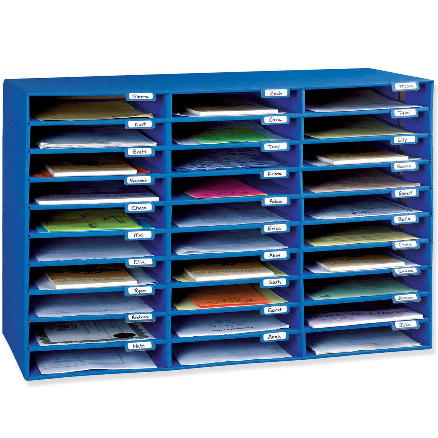Easy-to-assemble classroom mailbox with individual mail slots. The slots are designed to hold a variety of materials and have an individual name tab for each one.