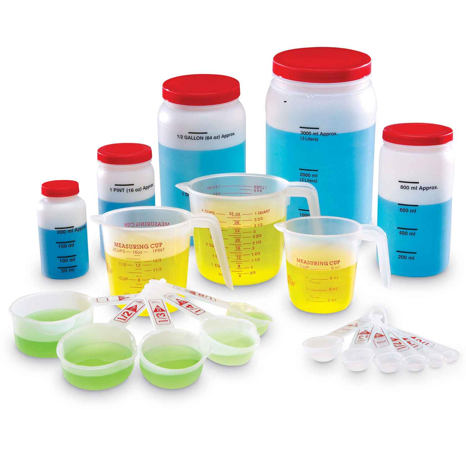 This deluxe set is the perfectly-sized classroom set for learning measurement equivalents. Students practice customary capacities, liquid measurement and metric conversions with suggested activities.