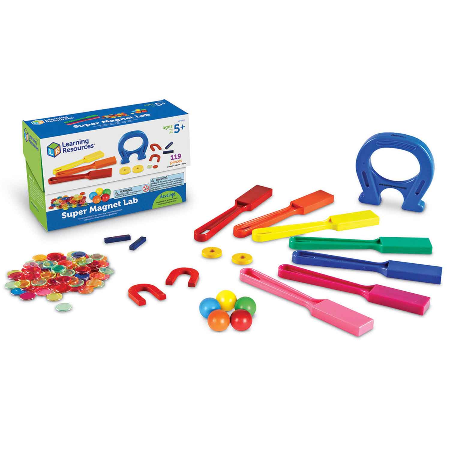 - Includes 100 magnetic chips, 5 large magnetic marbles, 7 magnetic wands, 2 metal bar magnets, 2 metal ring magnets, 2 mini metal horseshoe magnets, 1 large plastic horseshoe magnet, storage box and activity guide