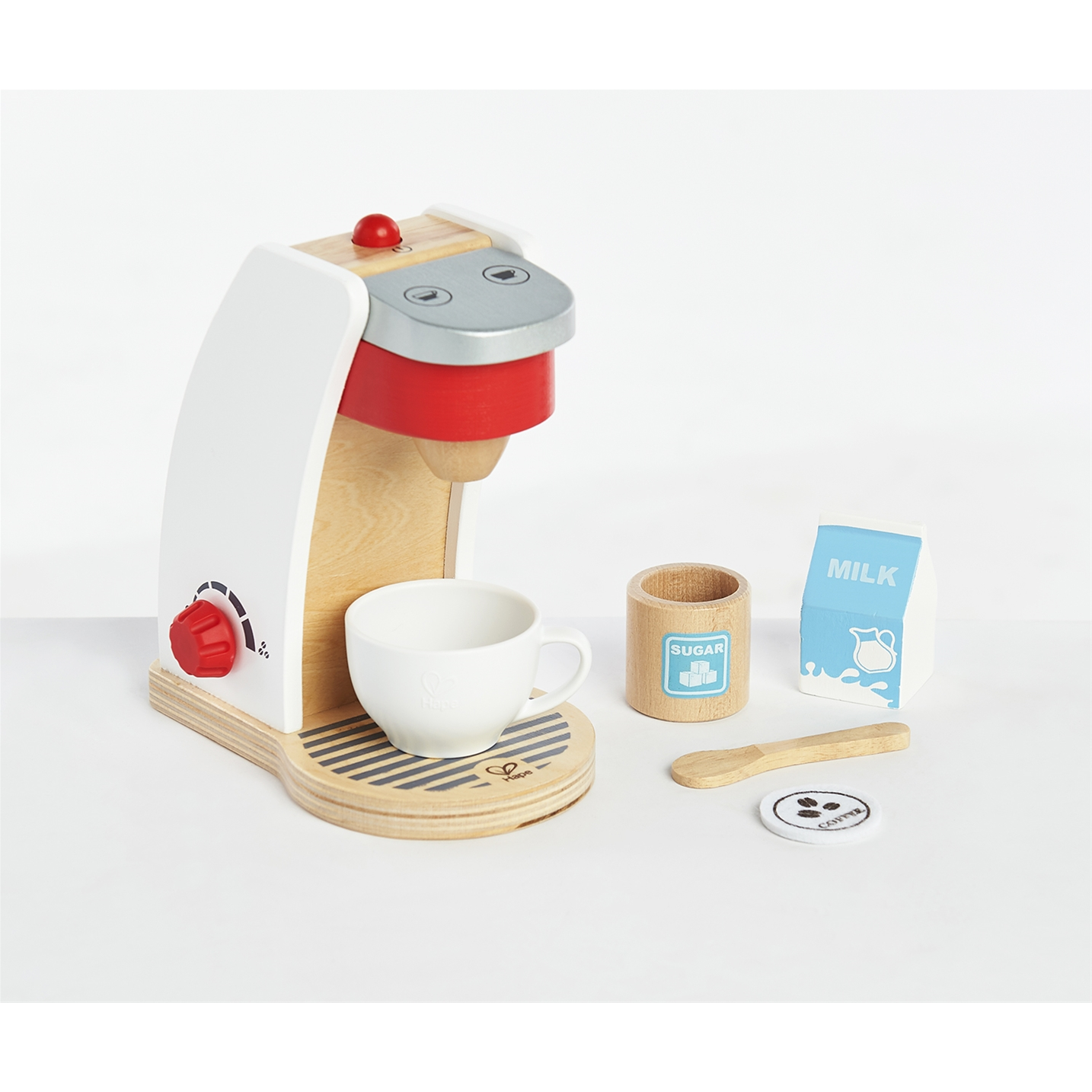 Perk up imaginary play with this single-serve coffee maker kitchen play set. Children will love pretending to make their own coffee. This wooden coffee maker toy promotes storytelling, role-playing, and creativity. Accessories include: Mug, Spoon, Milk, and Sugar. A charming and unique addition to any dramatic play area!