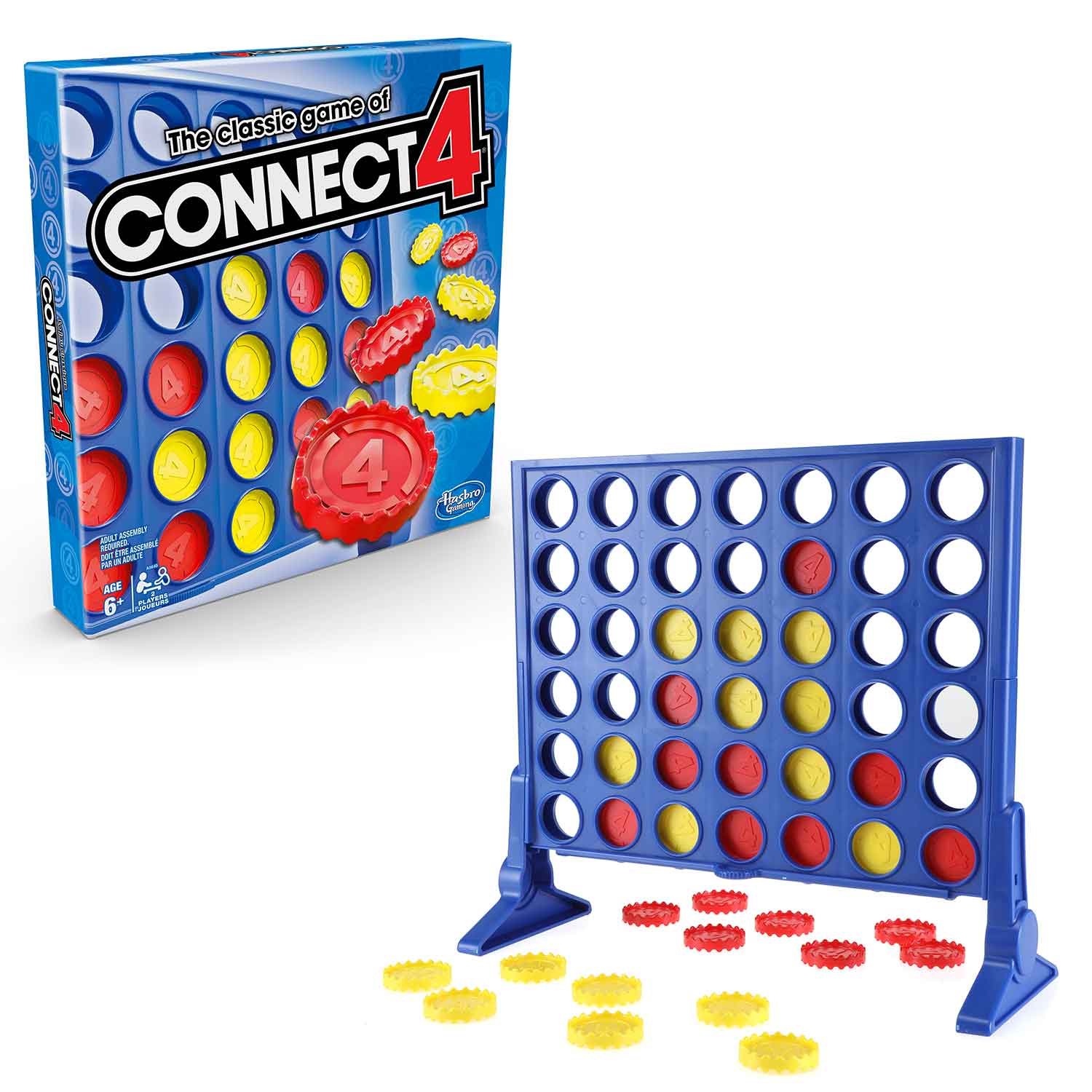 - Includes grid, 2 legs, slider bar, 21 red discs, 21 yellow discs, and instructions