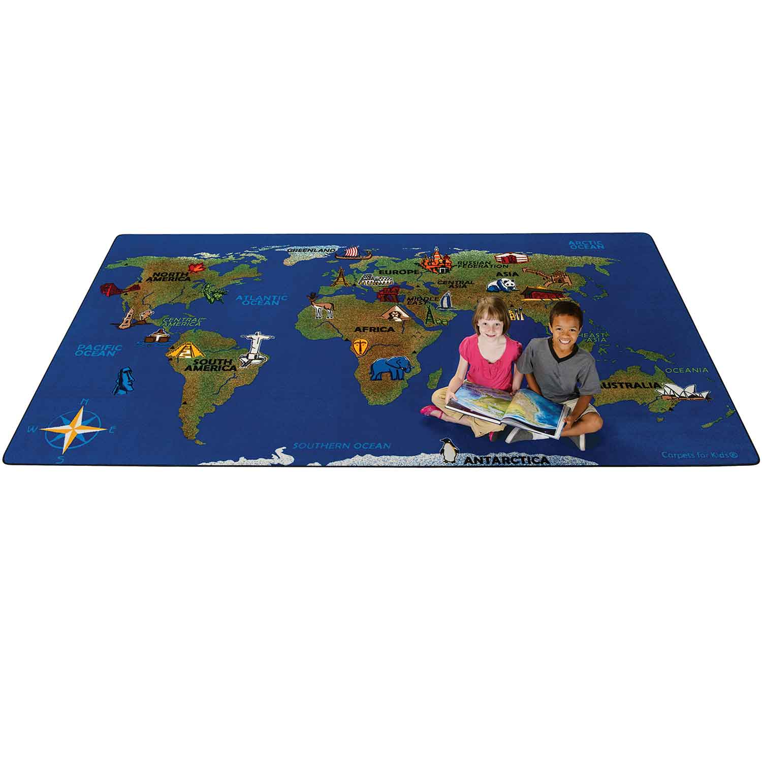 Discover the continents with the Continental Wonders Rug. This classroom rug features a map of the world and highlights many geographic icons across the globe. It is a great tool for learning and will be a wonderful addition to any room.