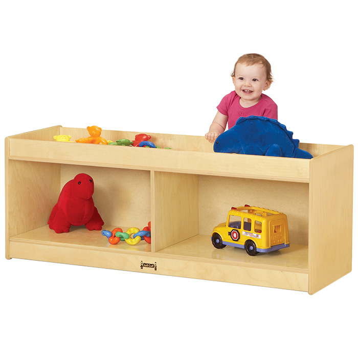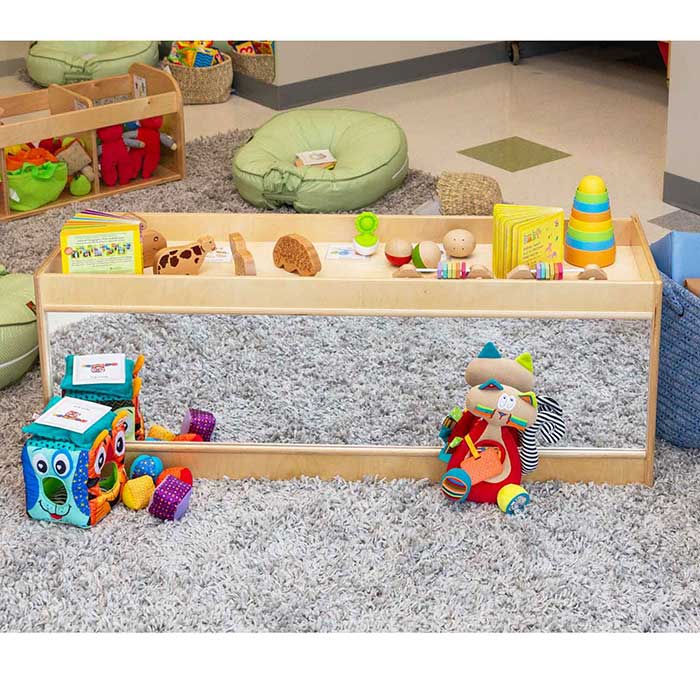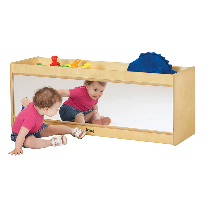 Little "cruisers" can learn to stand, practice walking, discover themselves in the mirror and locate toys in this tot sized center. Top ledge helps keep toys off the floor. Extra safe acrylic mirror on one side, storage on the other.