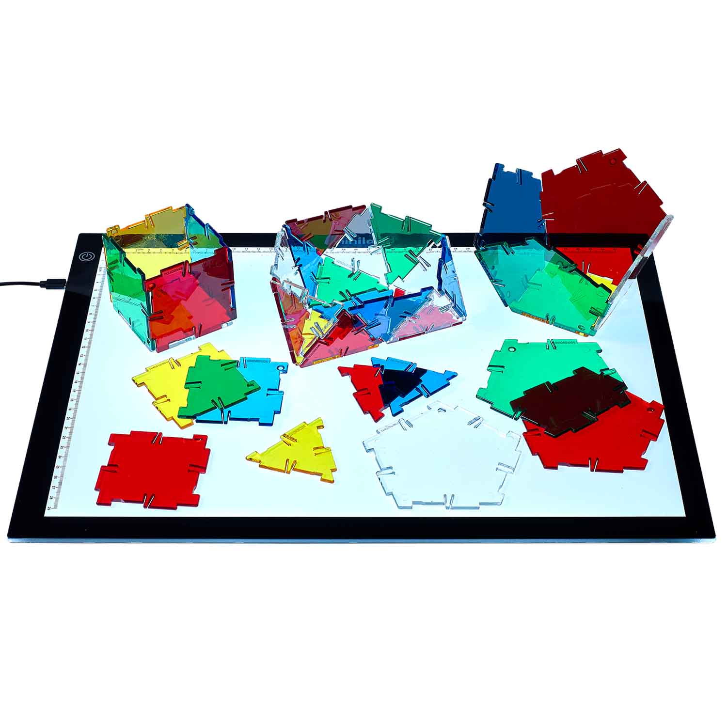 Great for budding builders, this set was designed to work on a light table or against a light source. It features red, yellow, blue, green and clear pieces in 3 key shapes (squares, equilateral triangles and pentagons) allowing children to construct their first 2D & 3D shapes with ease!