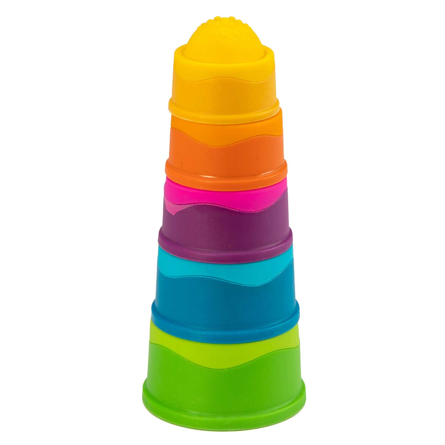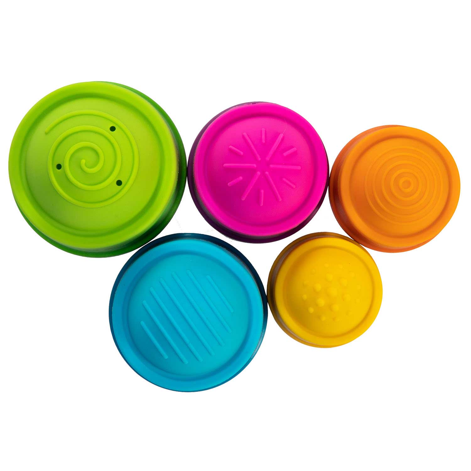 A stack-and-discover experience with squishy, silicone textured bubbles on each piece to push and pop for a fun, sensory experience. Each cup features a unique texture pattern. Little fingers will love to touch, push, and pop them again and again. Dimpl Stack encourages fine motor skills, spatial reasoning, sensory learning, tactile exploration.
