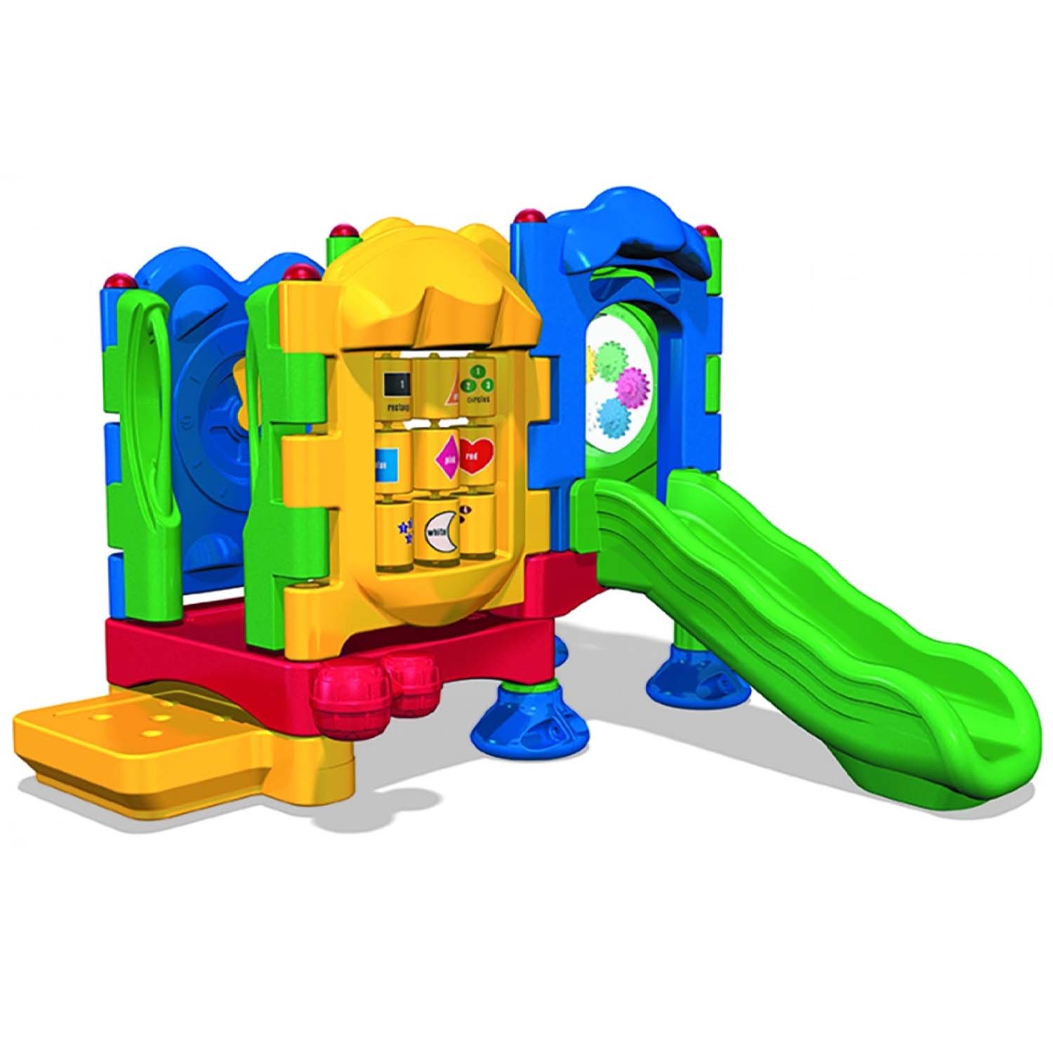 This two-deck structure features a multitude of activities for the youngest 6-month old to the busiest 23-month old, while offering nature inspired detail integrated throughout the structure. The window panel allows children to peek at their classmates below while the Rain Wheel and Gear Panel offer learning opportunities about cause and effect as they realize the noise they can make with a simple spin. The entryway of the structure also features handrails so children can enjoy an easy transition to the first deck.
