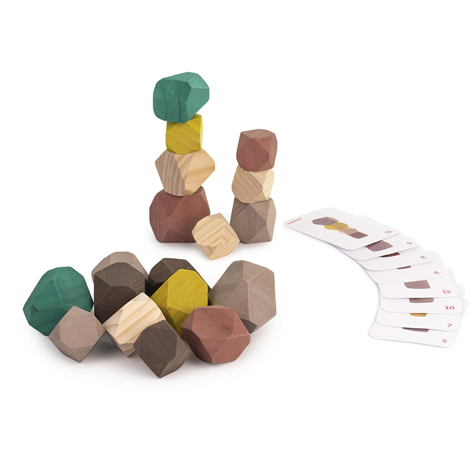 These wooden stones are made of different shapes and colors simulating the appearance of gem stones. Great for stacking and developing fine motor skills.