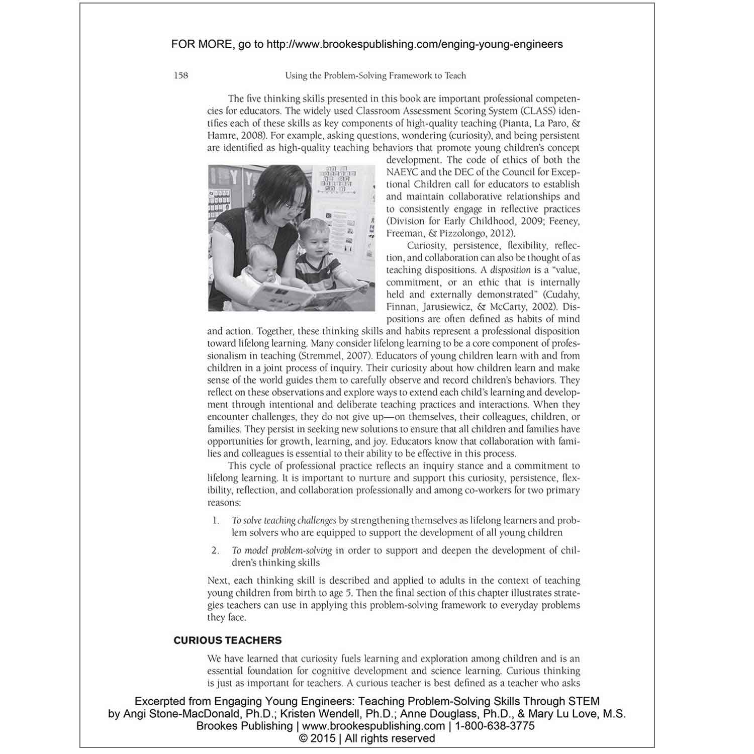 Help young children develop problem-solving skills, and you'll boost their kindergarten readiness and set them up for long-term success in STEM subjects. In this timely and practical book, you'll discover how to support the problem-solving skills of all young children by teaching them basic practices of engineering and five types of critical thinking skills (Curiosity, Persistence, Flexibility, Reflection, and Collaboration) and discover how to sharpen all these skills as a teacher! Using a clear instructional framework and fun activities tailored for infants, toddlers, and preschoolers, you'll help children birth to 5 explore big ideas and develop new ways of thinking through engaging and challenging learning experiences. A must for teachers in inclusive early education classrooms, this comprehensive guide is your key to teaching the 21st-century skills children need for STEM learning and school success.