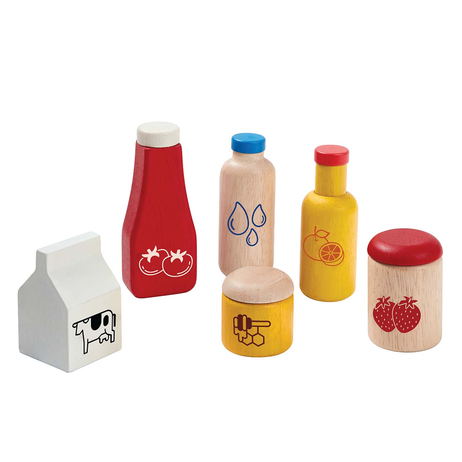 - 6 piece wooden grocery set (orange juice, water, milk, ketchup, jam, and honey)