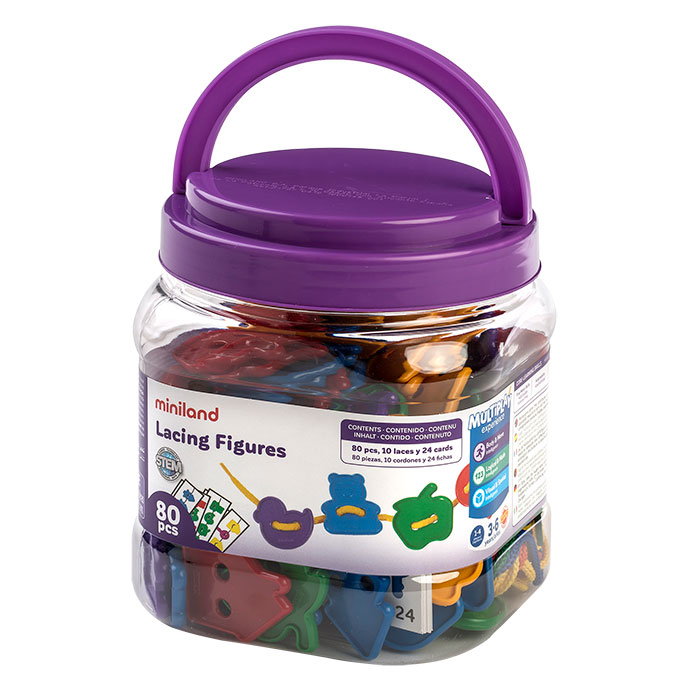 A lacing set with multicolored plastic shapes to threaded together.