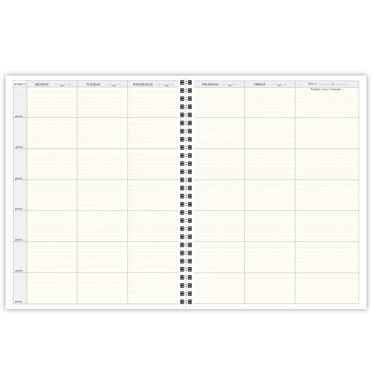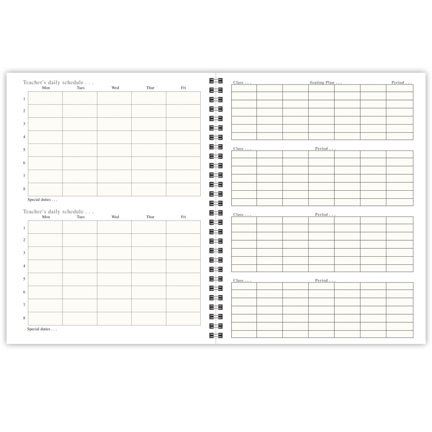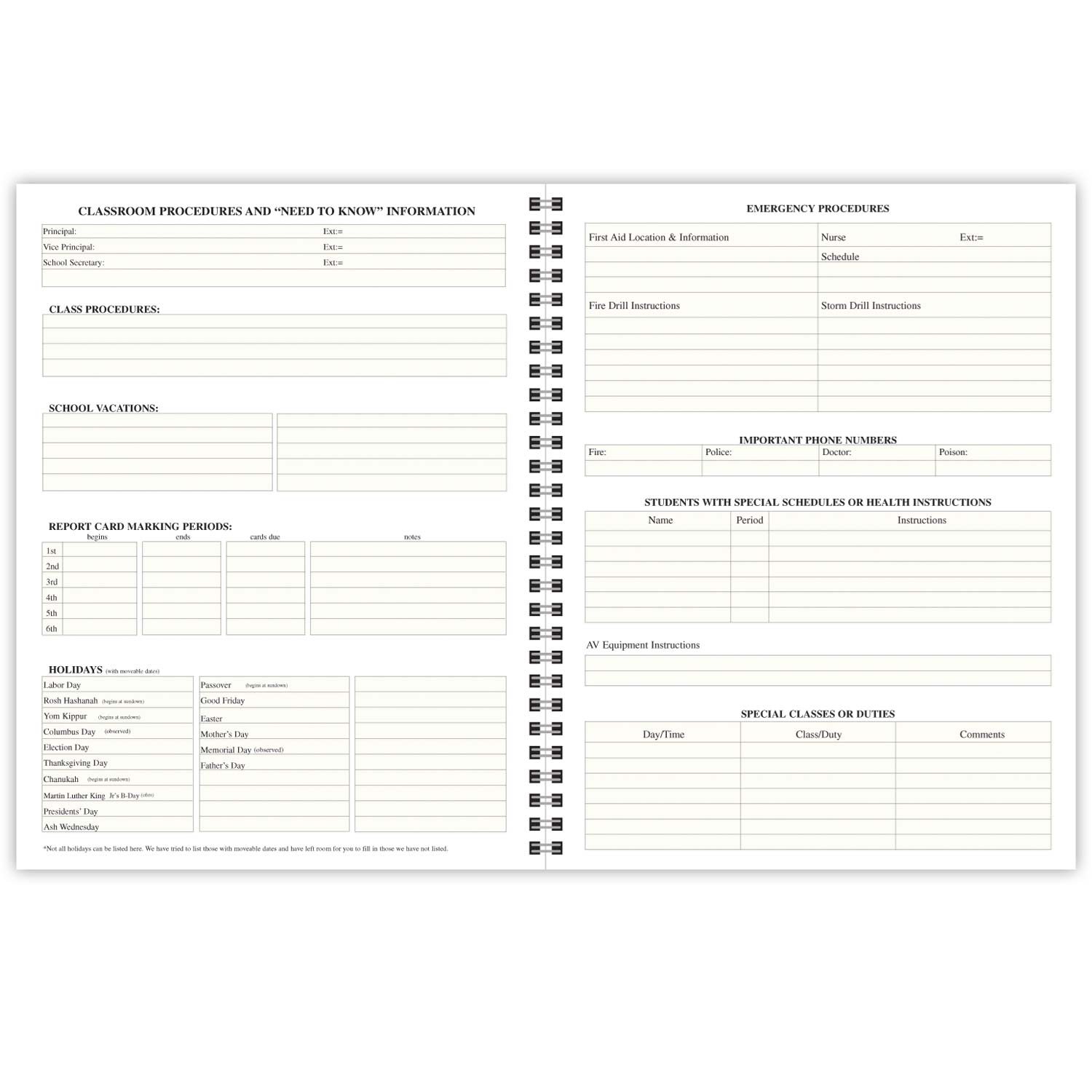 This 40-week lesson planner features a durable leatherette cover with spiral binding. The recording pages have 7-period vertically listed with the days listed horizontal across the top. Also includes planning sheets, seating charts, daily schedules, event calendars, and substitute teacher instructions. This book replaces Becker's Plan Book (#107).
