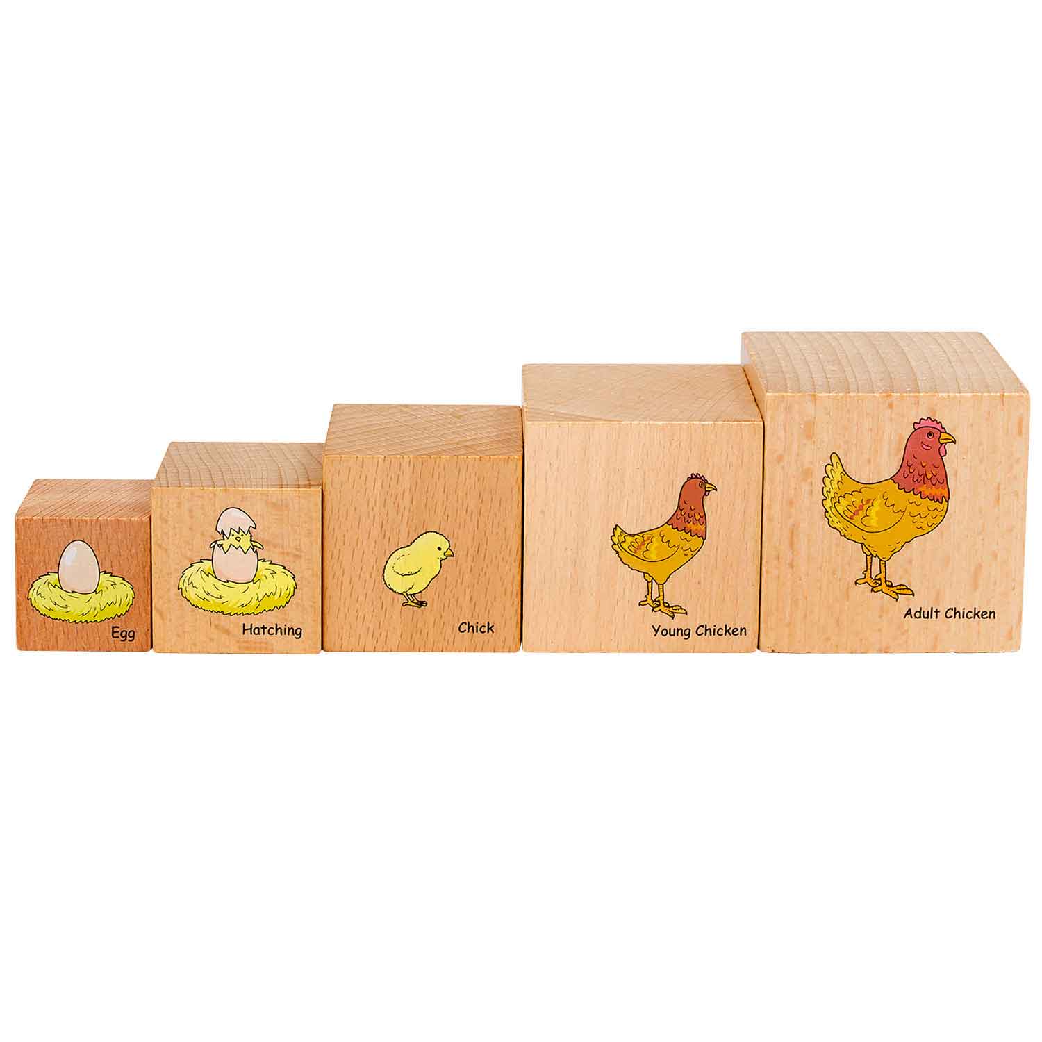 Easy to stack wood blocks show life cycles for a moth, butterfly, chicken, and frog. All five stages are illustrated and labeled so children can see how each animal develops through a series of changes. The largest block represents fully-grown animals and the eggs the smallest. Life Cycle Blocks are a perfect tool for early literacy and science and also for stacking and practicing hand-eye coordination.