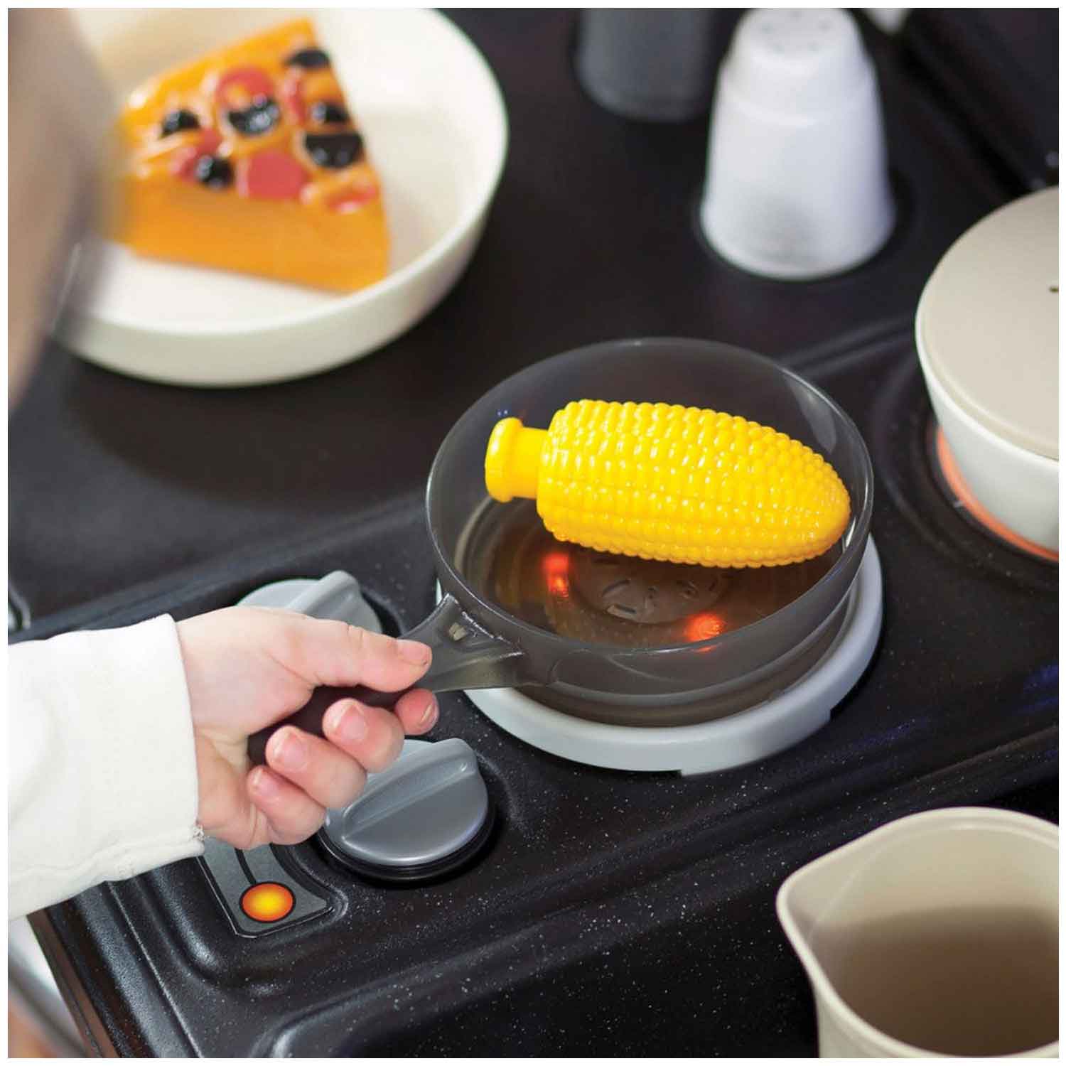 This roomy play kitchen includes cupboards, cabinets, pull-out drawers and bins that will neatly store all your kitchen accessories. Features include an electronic stove burner with lights and sound, and a fridge door with a molded-in pretend water dispenser. Pull-out silverware drawer keeps forks, spoons and knives neatly organized.
