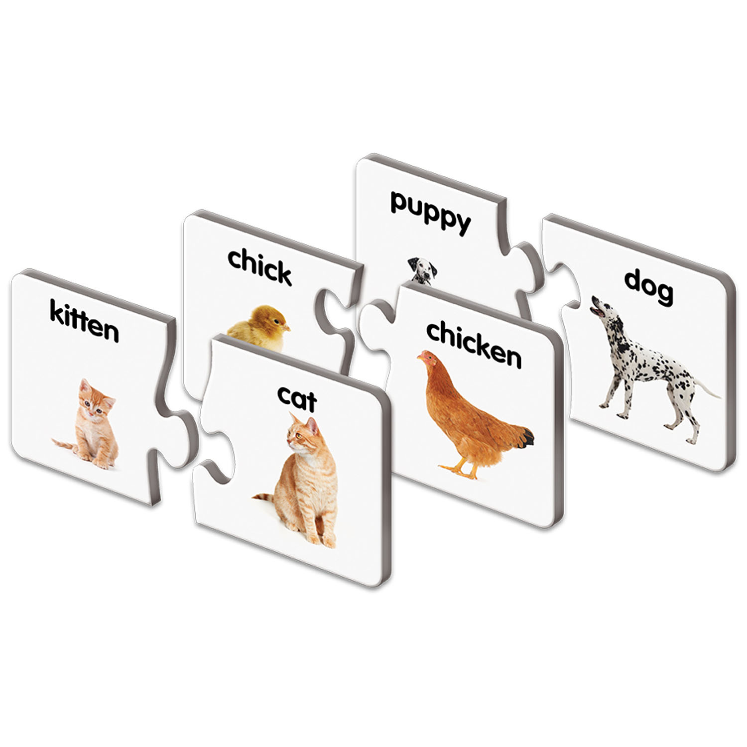 This colorful set of puzzle cards provides children with an excellent introduction to basic animal words and families. Each card features a picture of either an adult animal or young animal. Simply match the correct pieces together to complete the puzzle. The puzzles are self-correcting as no two puzzle cuts are the same.