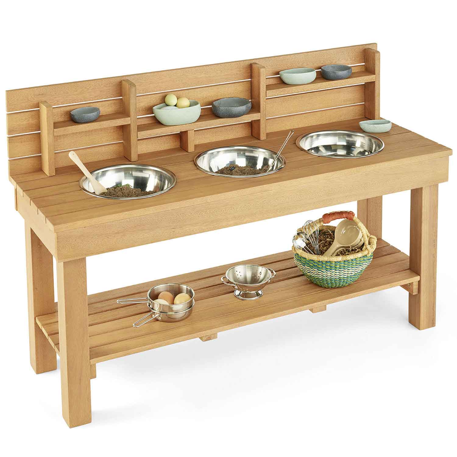Encourage hours of open-ended creative play outside with this mud kitchen. Made of solid eucalyptus, it features three stainless steel bowls plus attractive shelf storage for accessories. Boost imagination, communication and social development through fun role play outdoors!