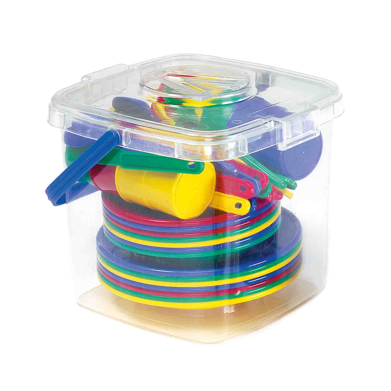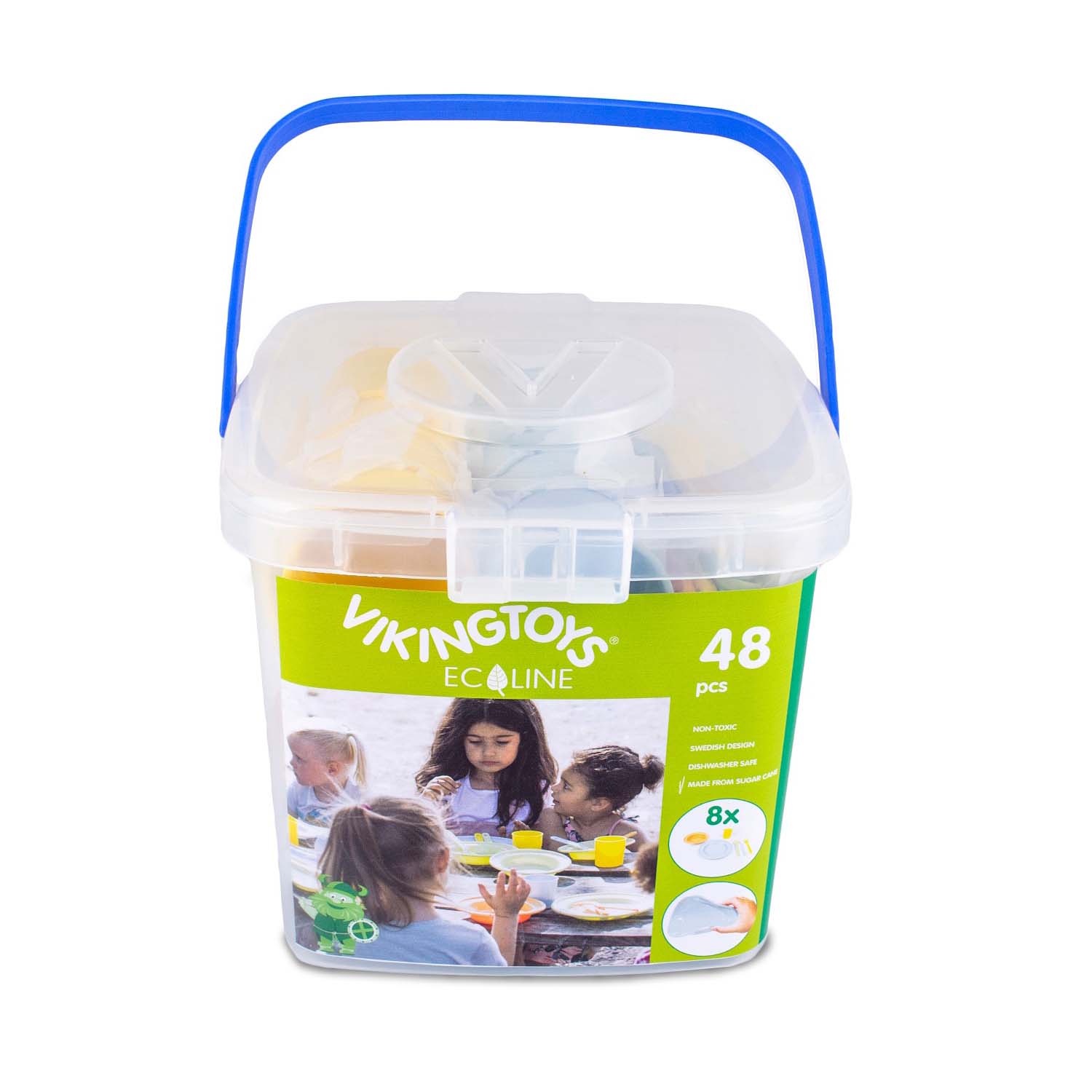 Introduce toddlers to their first dining set! Flexible, durable plastic will hold up to indoor and outdoor use. Includes 8 place settings in clear storage container.