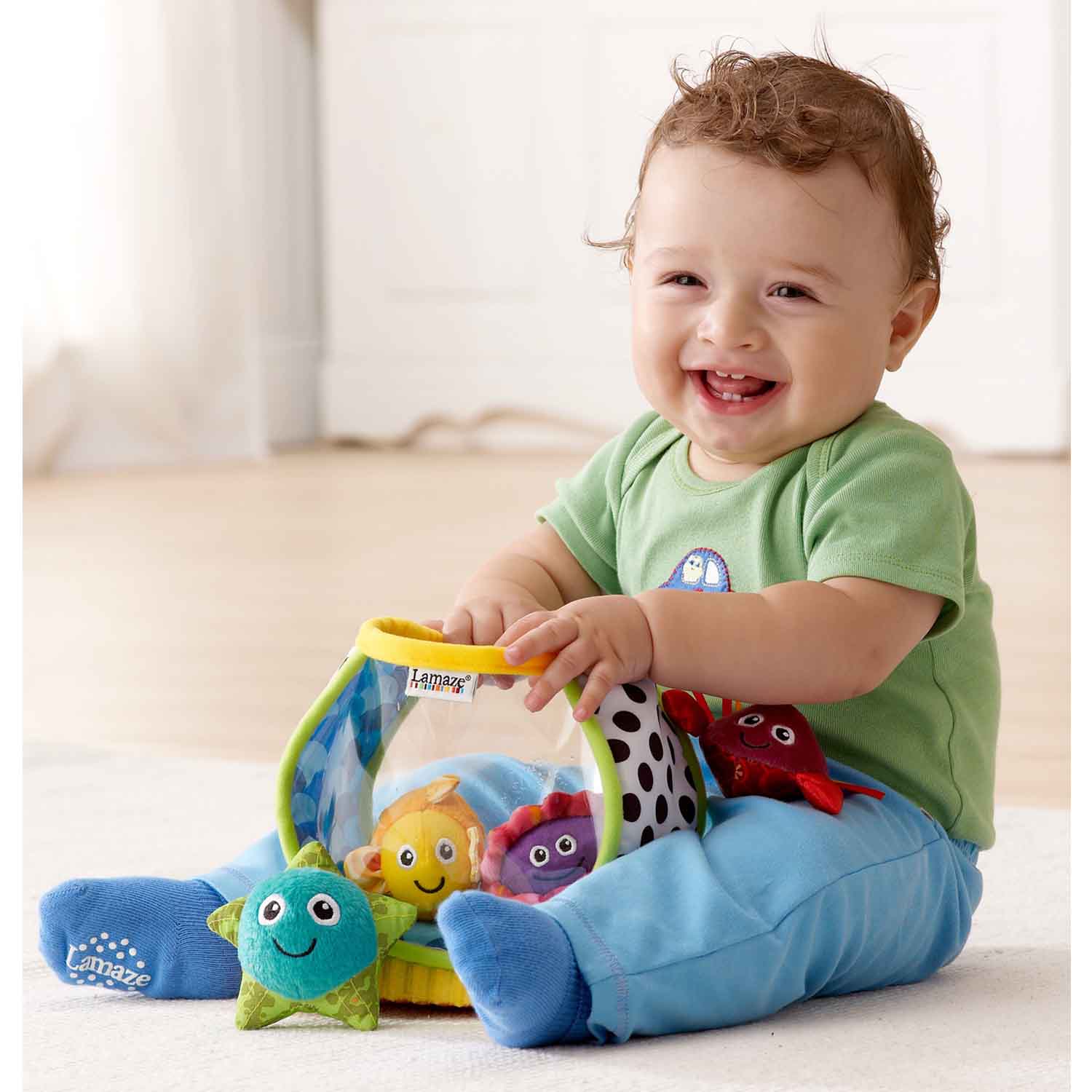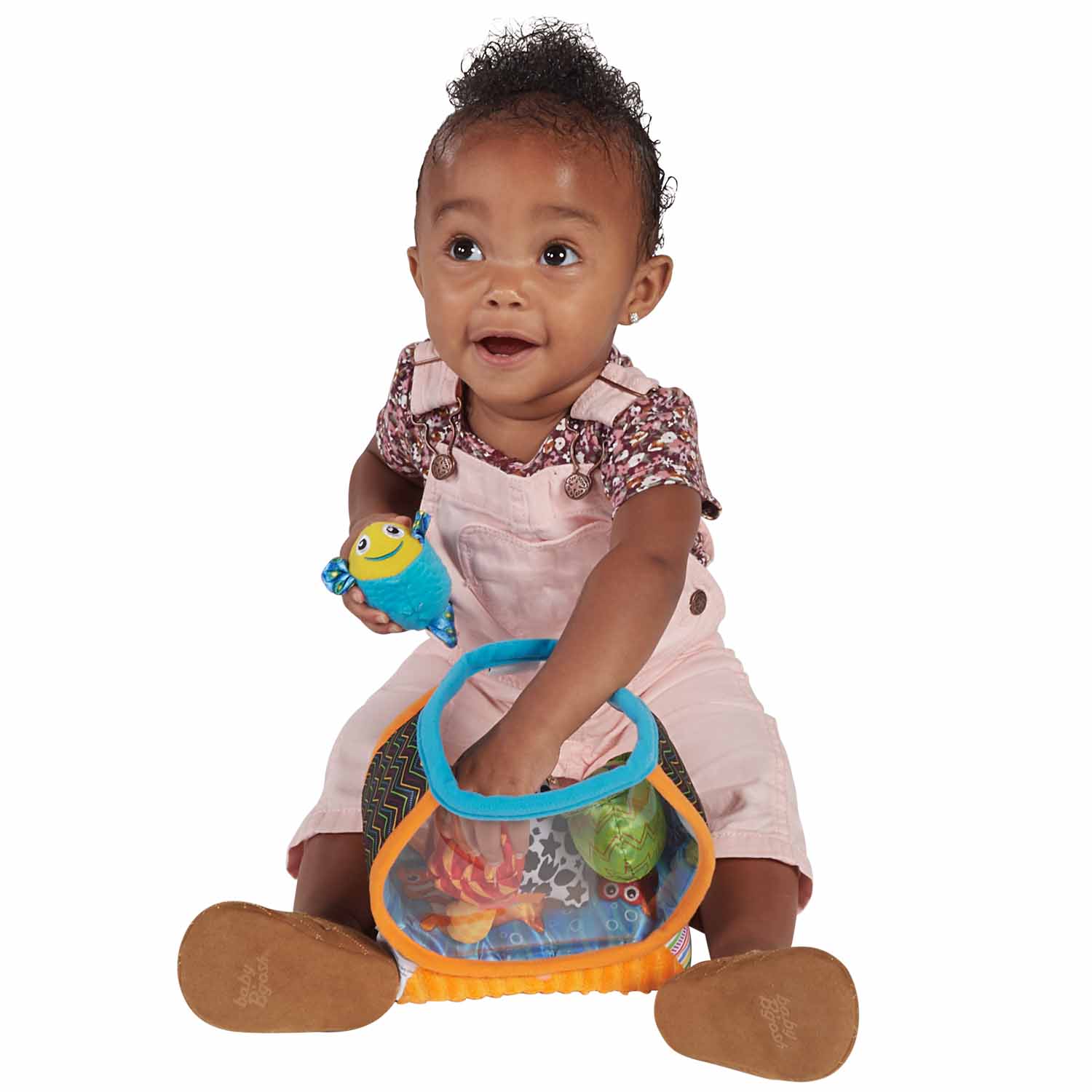 A creative version of the put-in, take-out concept, this fun fishbowl includes four textured sea creatures that each make a different sound - crinkle, rattle, jingle, or squeak! These easy-to-grasp creatures help develop hand-eye coordination and are full of textures for baby to explore.
