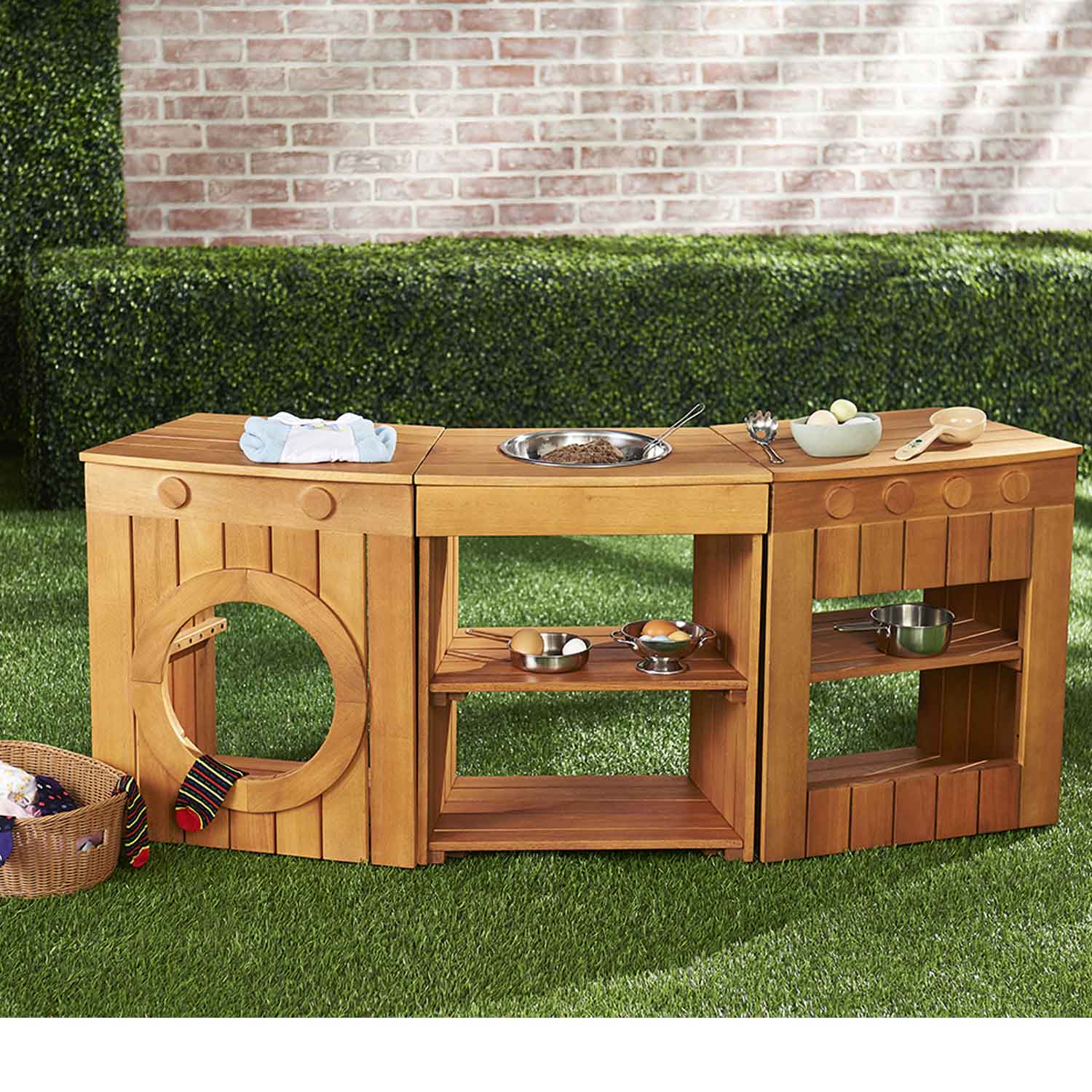 This wooden kitchen set is perfect for making mud pies and other natural delicacies! Includes a stove, sink and washing machine. Made of solid eucalyptus, it can be used both indoors and out!