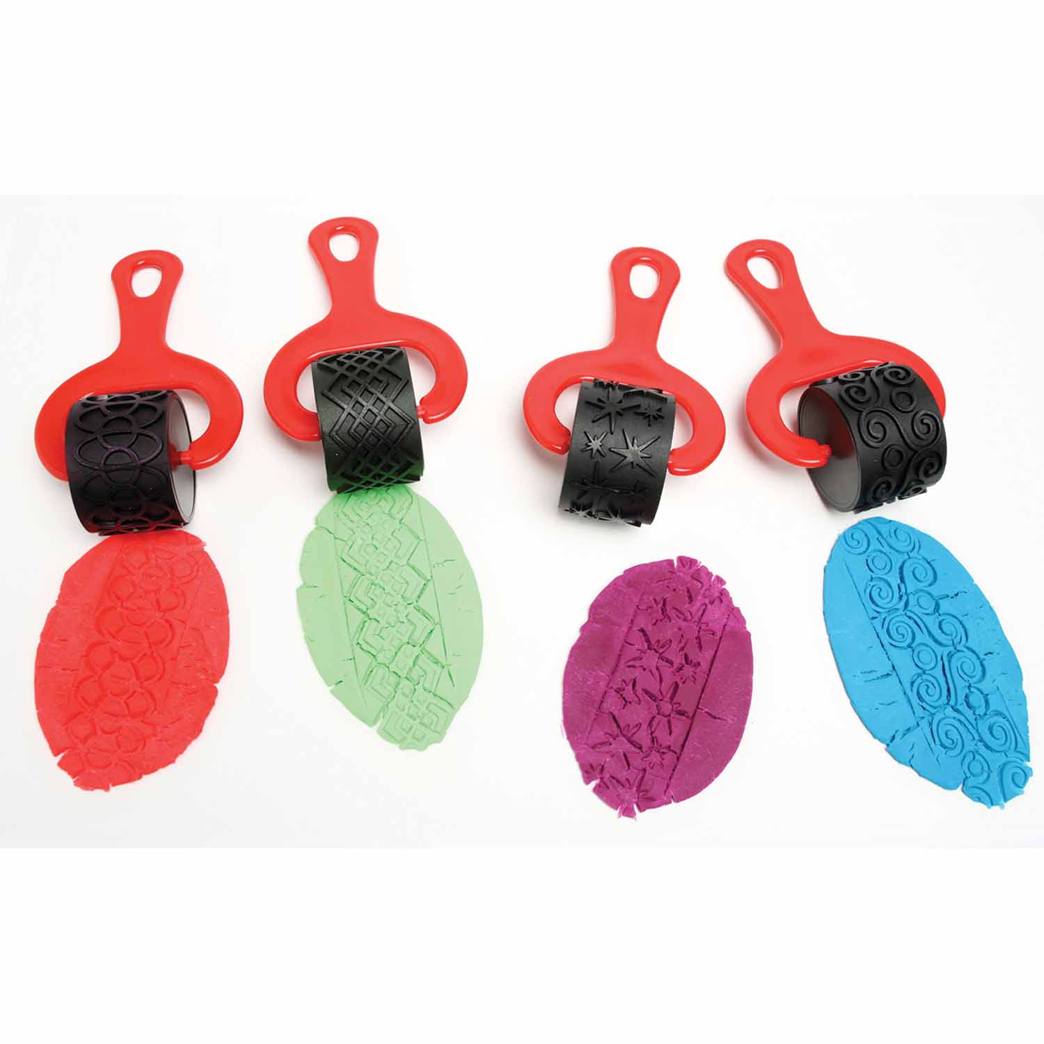 Here's a superset of four heavy duty rollers with 1½" wide unique, inventive, and clever designs for use with paint or clay. Each 5" durable plastic, comfort-grip handle features a unique design molded in hard rubber on a sturdy roller. Rollers are easily cleaned allowing for child-safe, long term use.