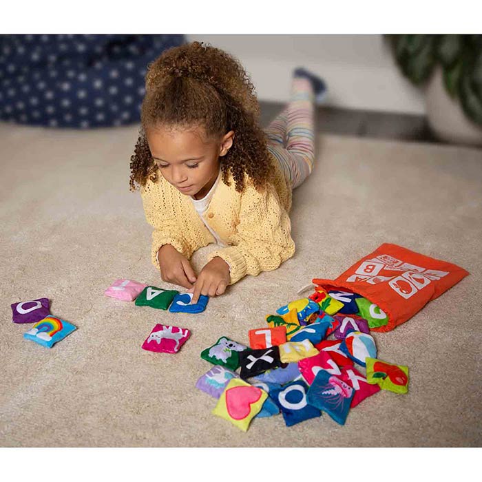 “Catch” onto letter names and sounds with this set of 34 double-sided bean bags featuring letters A-Z and a picture representing the letter sound.