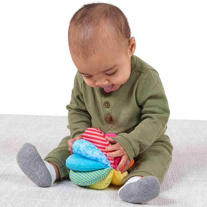 Soft rainbow ball to toss or roll featuring different materials, sounds and textures.