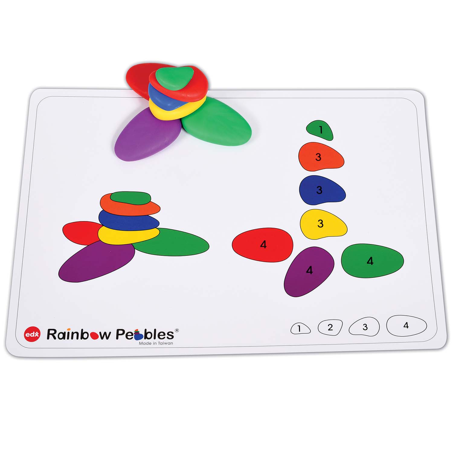 - 48 plastic pebbles (4 sizes & 6 colors) and 12 double-sided full-color activity cards