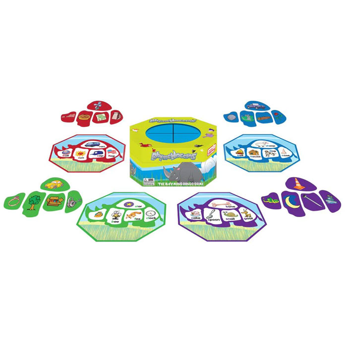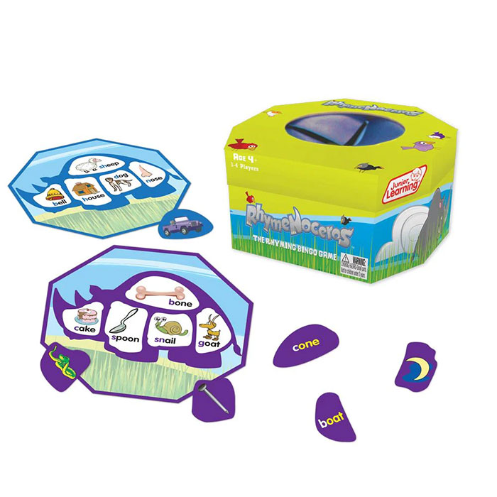Enhance early literacy skills with Rhymenoceros, the rhyming bingo game. Match objects in the box to rhyming pictures on the rhino puzzle board. Develop phonological awareness and rhyming word recognition in a fun and interactive way.