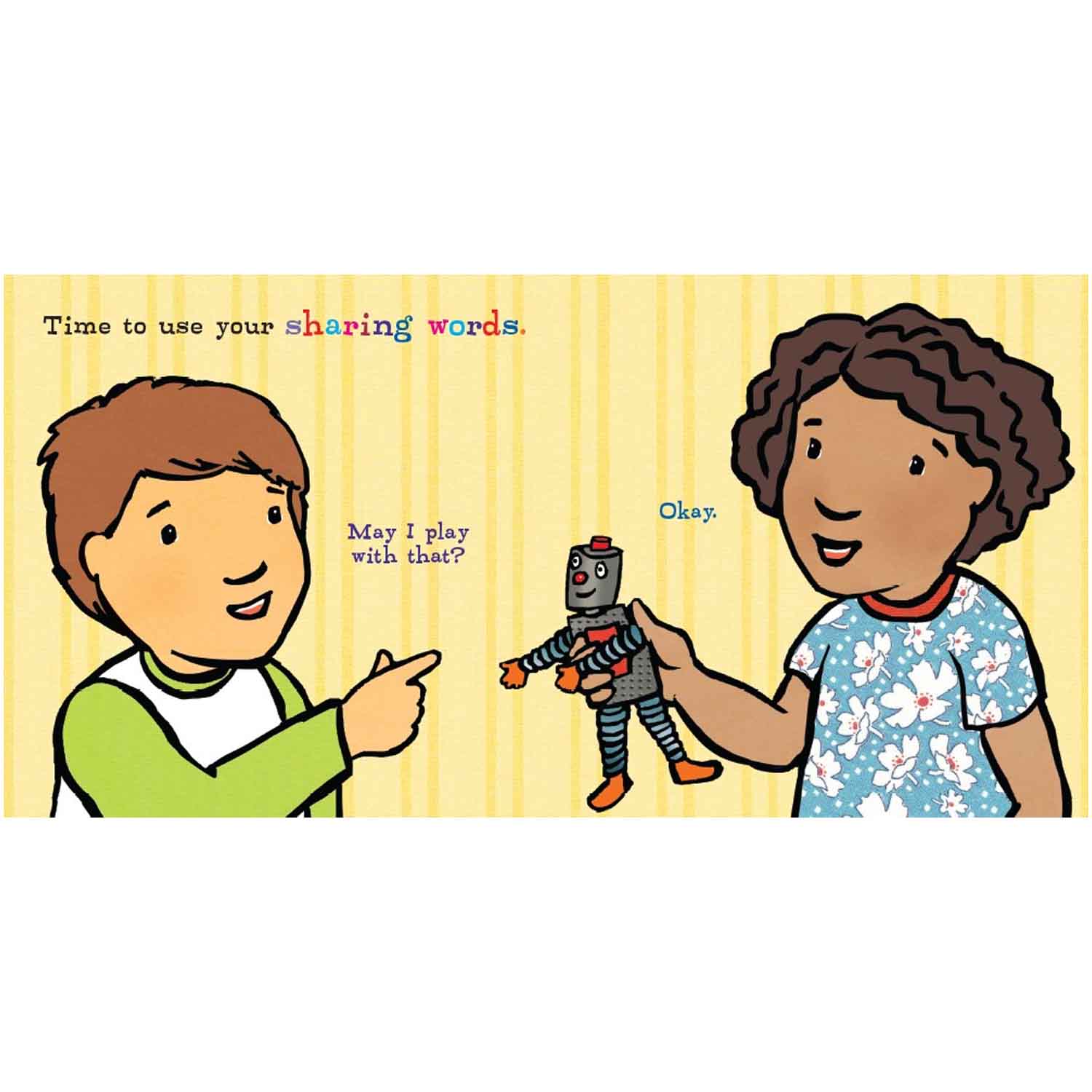 Sometimes it’s fun to share, and sometimes it’s hard. This book offers toddlers simple choices (take turns, use it together, wait for another time) to make sharing easier, and shows them where to turn for help when sharing is difficult. Little ones learn that sharing can mean double the fun - and sharing a while can make someone smile!