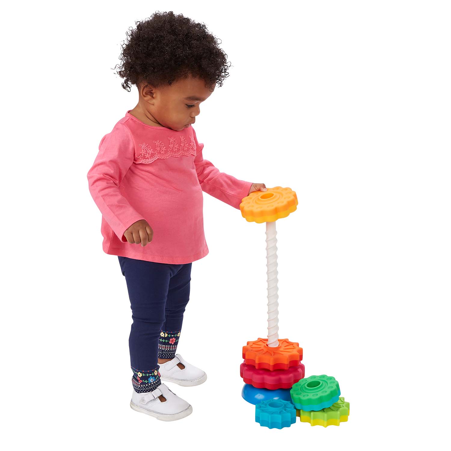 Place the sequentially sizes discs on the corkscrew-shaped rod one at a time and watch with fascination as they spin, twirl, and whirl to the bottom! Each disc is dual-colored, and from largest to smallest, they form a dynamic rainbow utilizing fun shades like magenta, lime, and teal, and your more traditional shades of lemon, red, and sky blue. The star-like discs alternate between daisy style and star-burst shapes, too.
