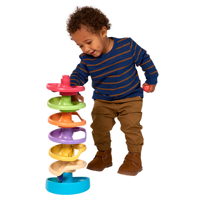 This 7-tier tower includes three marbles that are safe, easy to grasp, and filled with beads to add an audio effect!