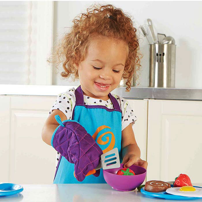 Prepare children for future kitchen chores with pretend versions of popular cooking tools. Includes an easy on/off apron, oven mitt, and a chunky, easy-to-hold plastic spatula and spoon.
