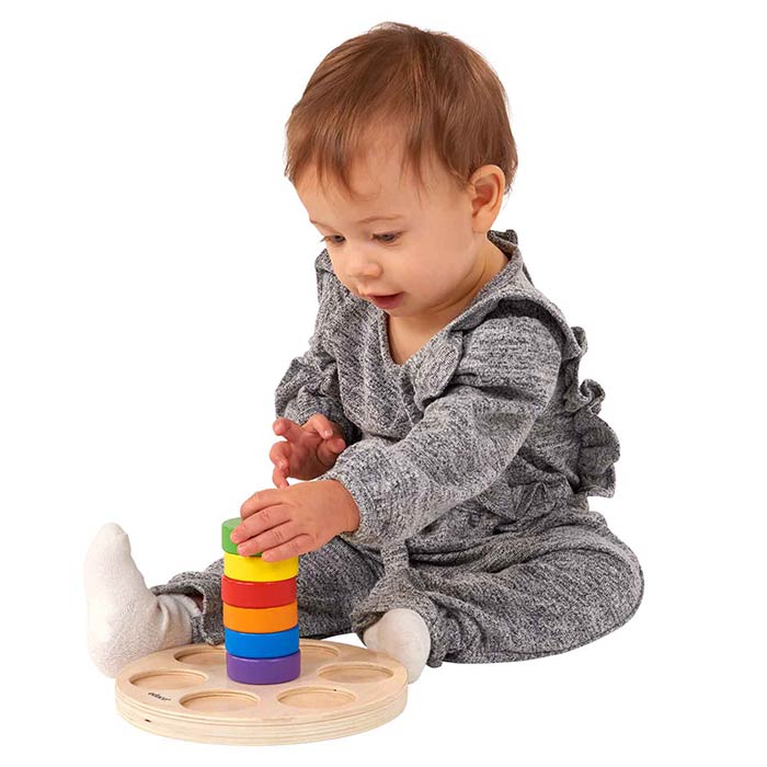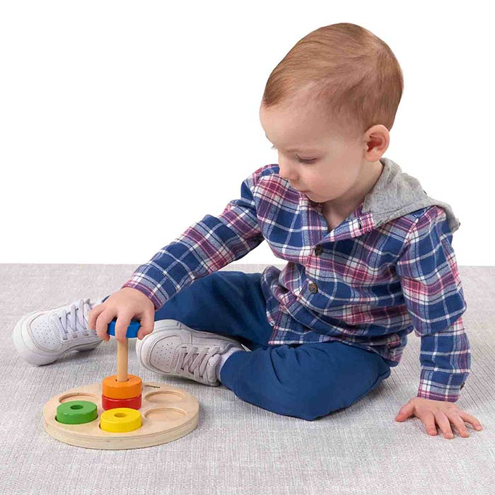 Young children can practice fine motor skills and eye-hand coordination as they slide the colorful wooden rings on the center pin.