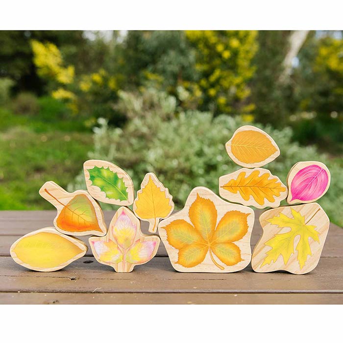 These double-sided, stackable leaf blocks feature leaf shapes with summer illustrations on one side and fall on the other.