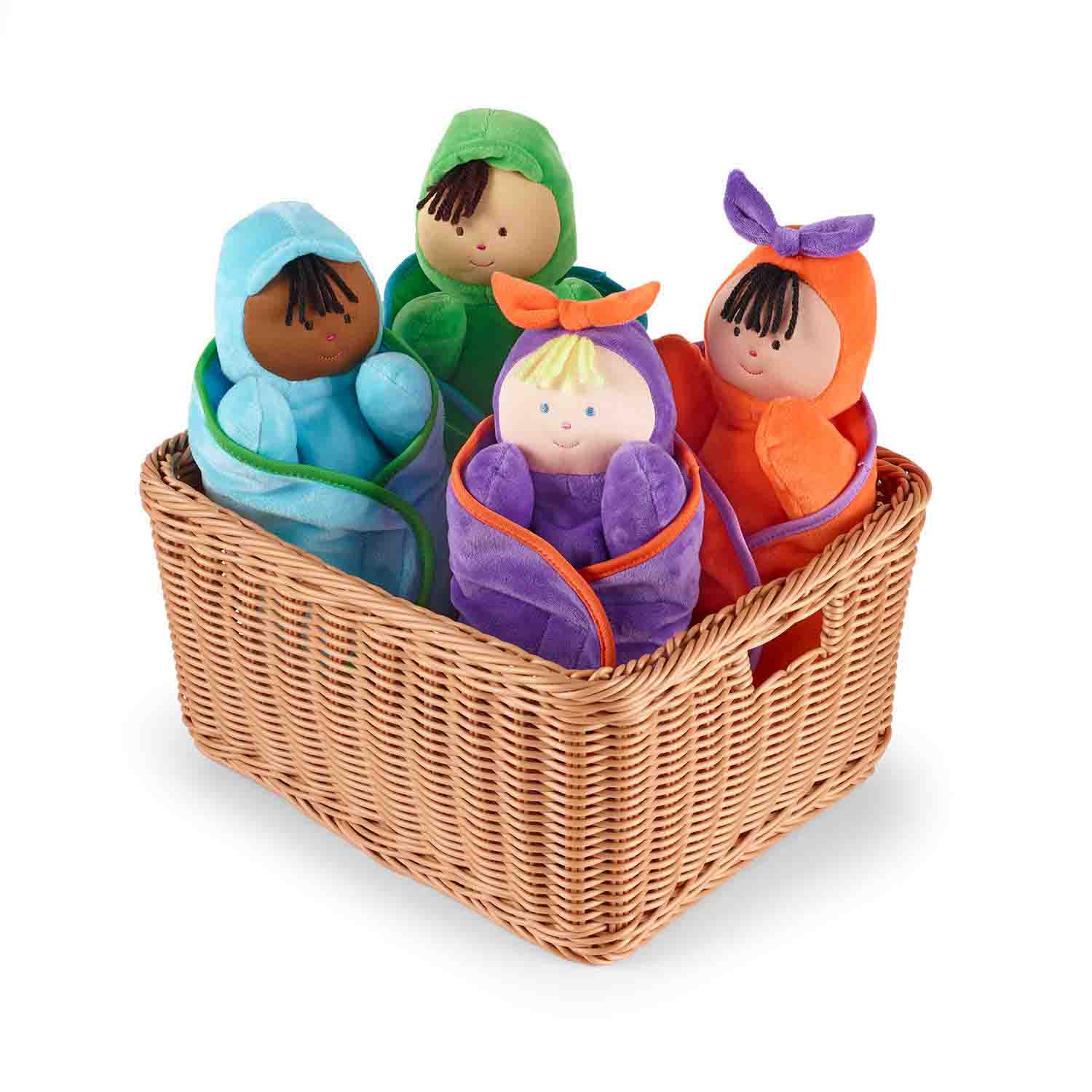 Cuddle these super-soft babies and wrap them in their colorful, matching swaddle blankets. Swaddles have easy hook and loop closures.