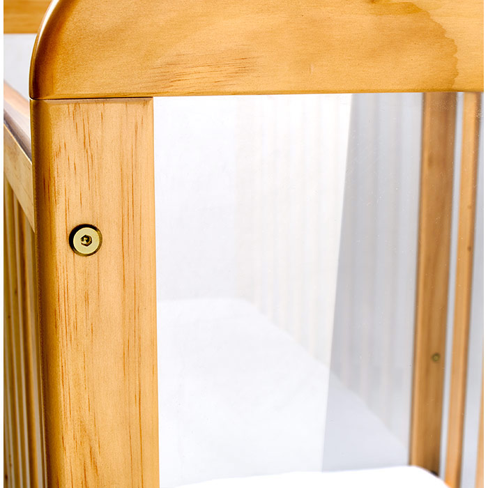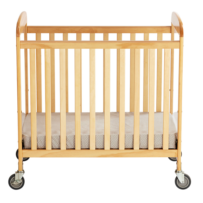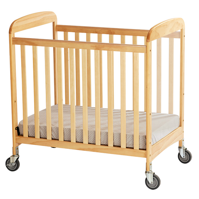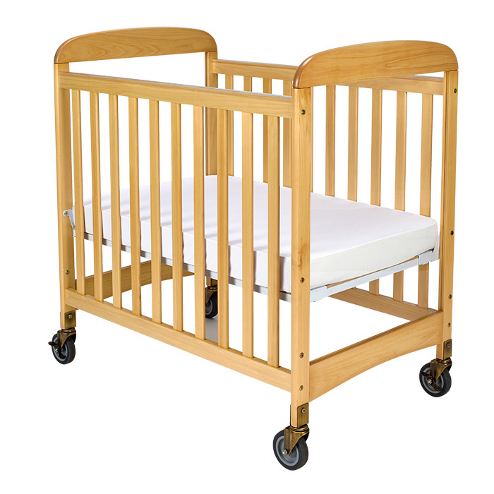 The Sweet Dreamer Crib features a reinforced metal frame mattress board support, natural wood slatted sides and clear, shatterproof acrylic headboards. The crib comes standard with a 2¾" vinyl-covered mattress and four heavy-duty casters (two locking) making it evacuation-ready.