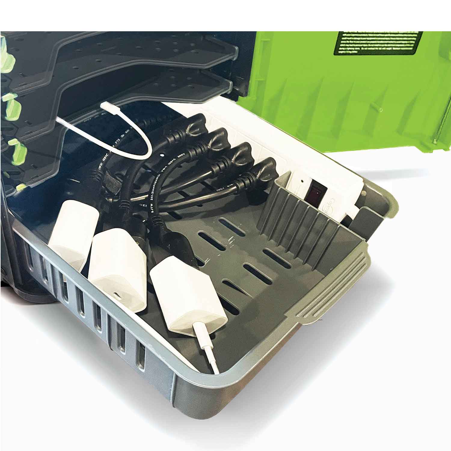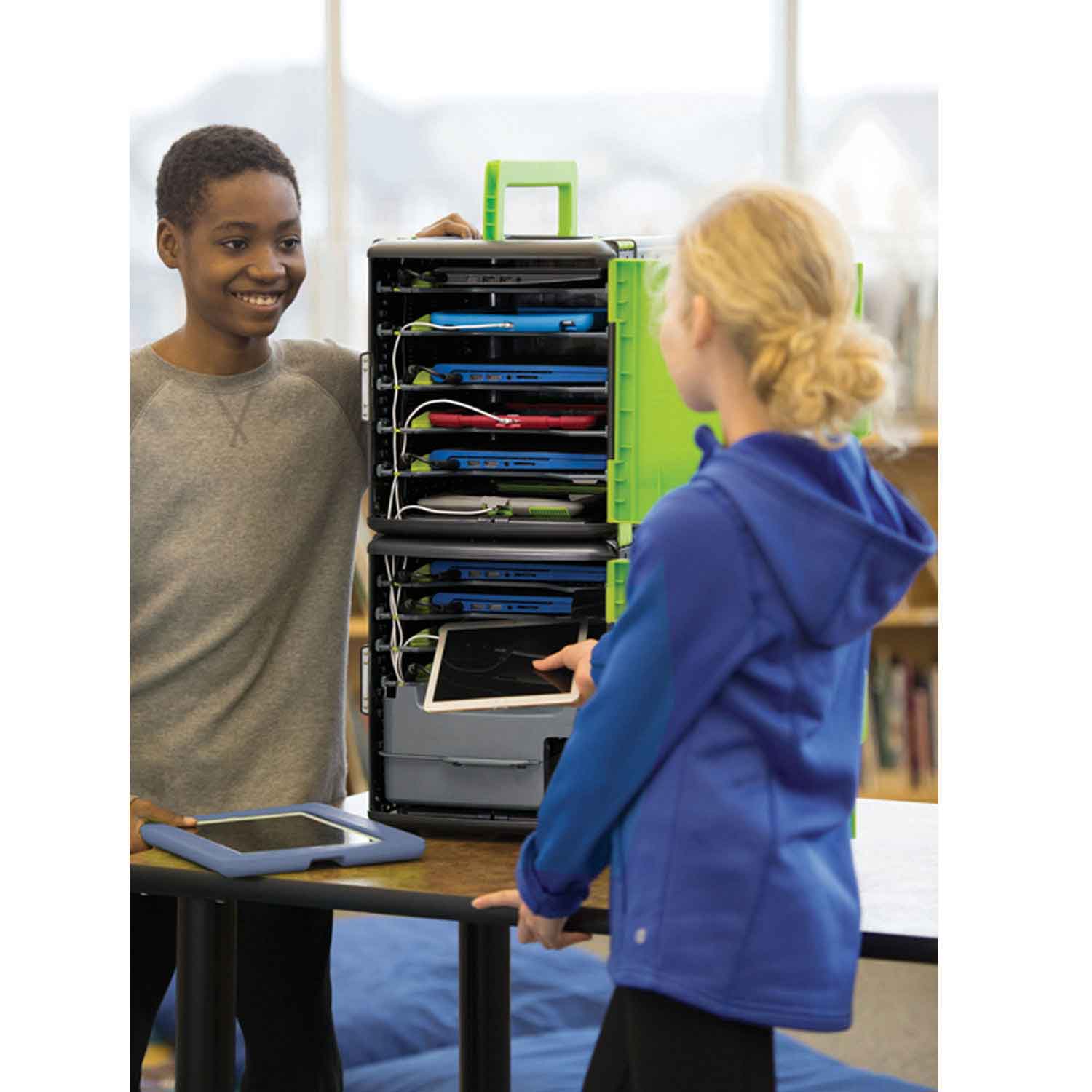 The Tech Tub2® offers an affordable, flexible and mobile solution for charging and storing iPads used in classrooms. It stores up to 10 iPads making is easy to store, charge and carry devices anywhere in the school. Adjustable shelves accommodate devices with and without cases. Includes 10 outlet power strip with surge protection (USB-C 20W Adapter). These Tech Tubs can clip and move together or can be two separate Tech Tubs to keep them separate.