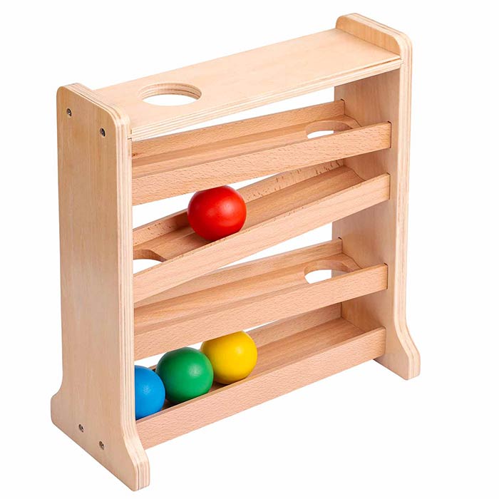 This wooden ball tracker is designed to develop visual tracking skills, hand-eye coordination and concentration as the child places a ball through the hole at the top and watches it roll down the ramps.