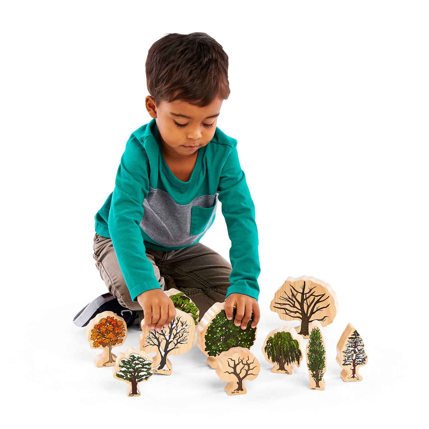 These tree-shaped blocks feature a variety of trees and show a different season on each side. Lightweight and made of solid wood, they are smooth, easy to handle and highly durable.