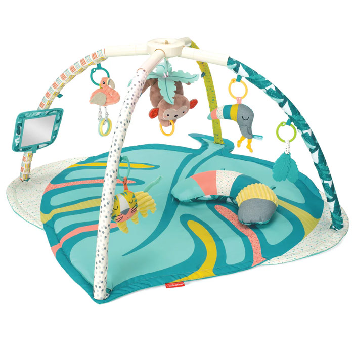 This colorful activity gym is loaded with great features including a tummy time bolster, peek n’ see mirror, comfy play mat, musical monkey and four sensory clip-on toys. Folds flat with a simple twist of the arches.