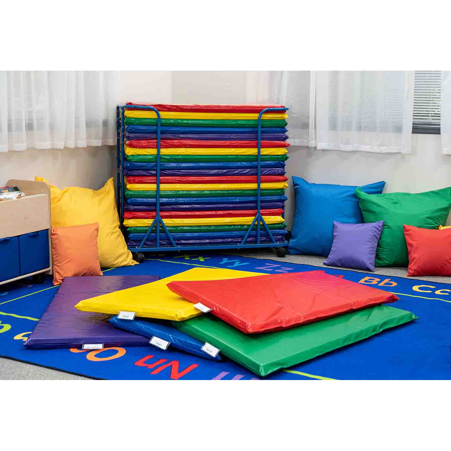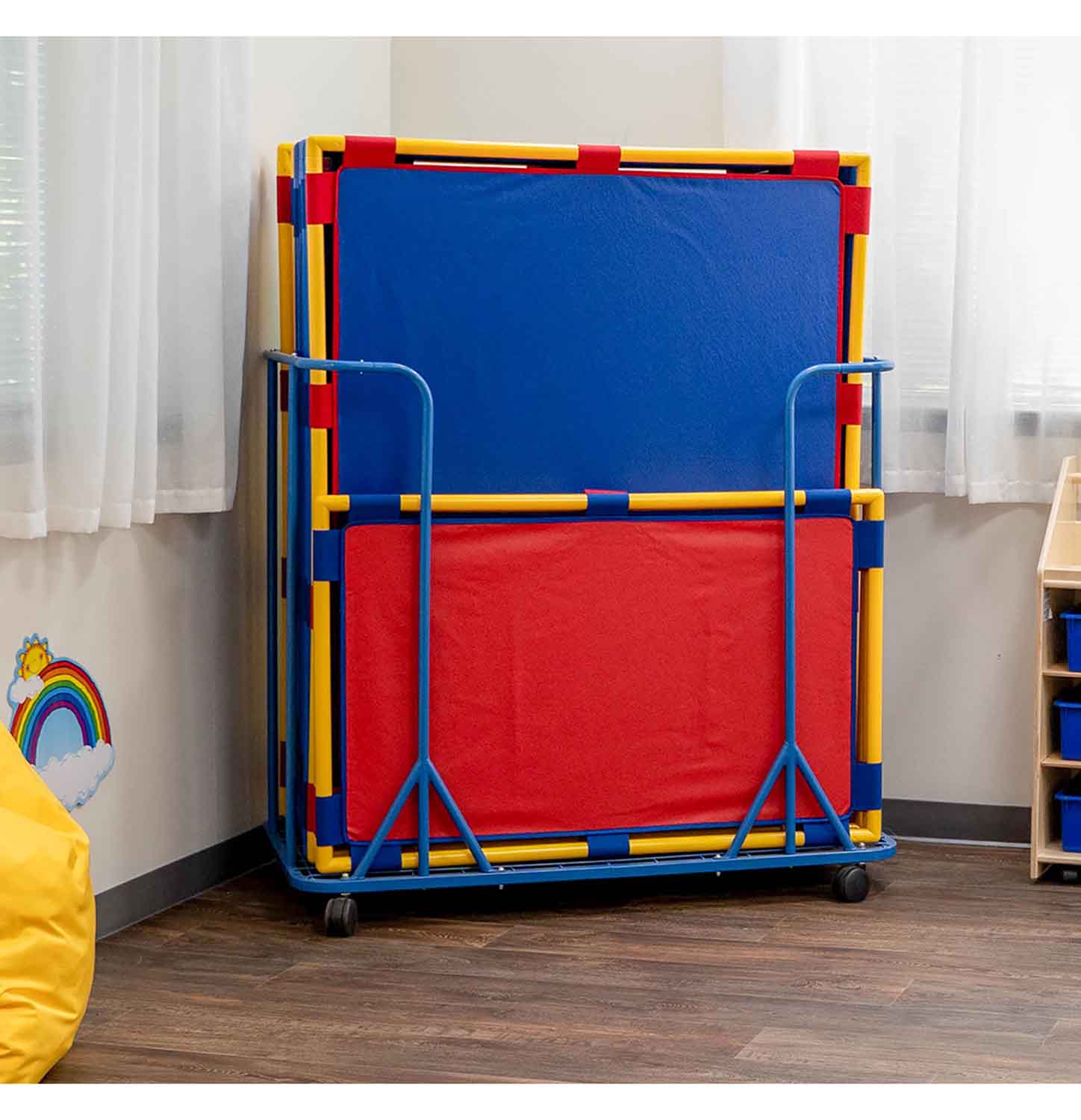 This universal cart stores 40 (1") or 20 (2") rest mats, modular block sets, and more! Cart is powder coated, heavy-duty steel and wire frame construction and rolls easily on four 3” rubber casters (2 locking).