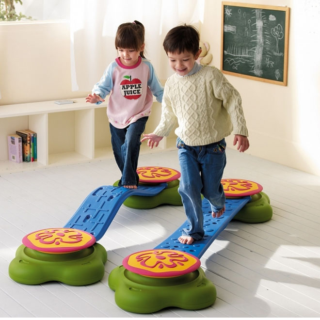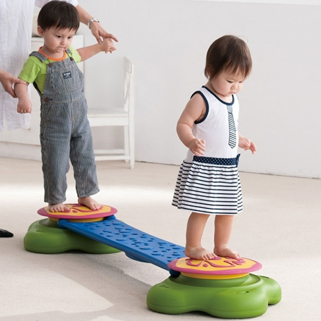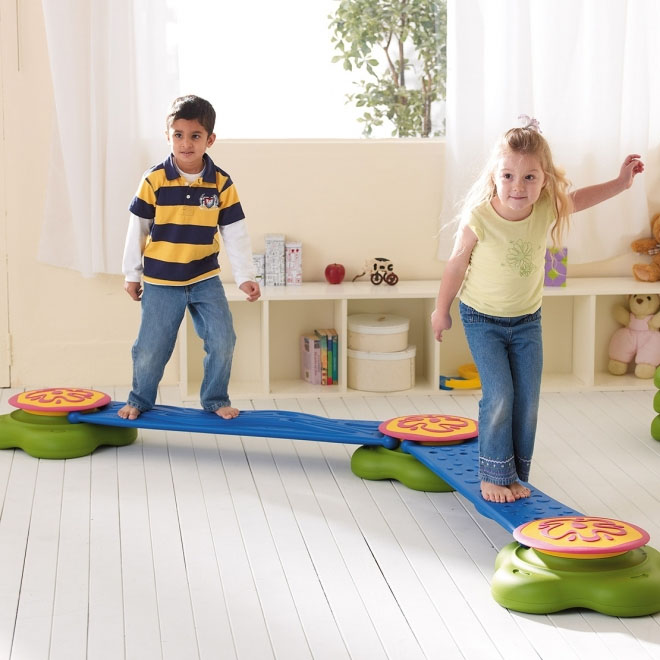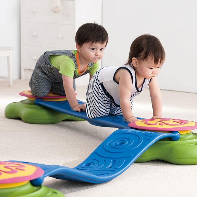 Inspired by a pool of water lilies, this set features green stackable islands and blue connecting bridges. Children will develop balance and motor skills while walking across the bridges or jumping from island to island, and the arrangements of various games can also help develop spatial awareness and improve problem-solving skills. Made of high-quality plastic with anti-slip material. 6-piece set includes four islands, one flat bridge and one curvy bridge.